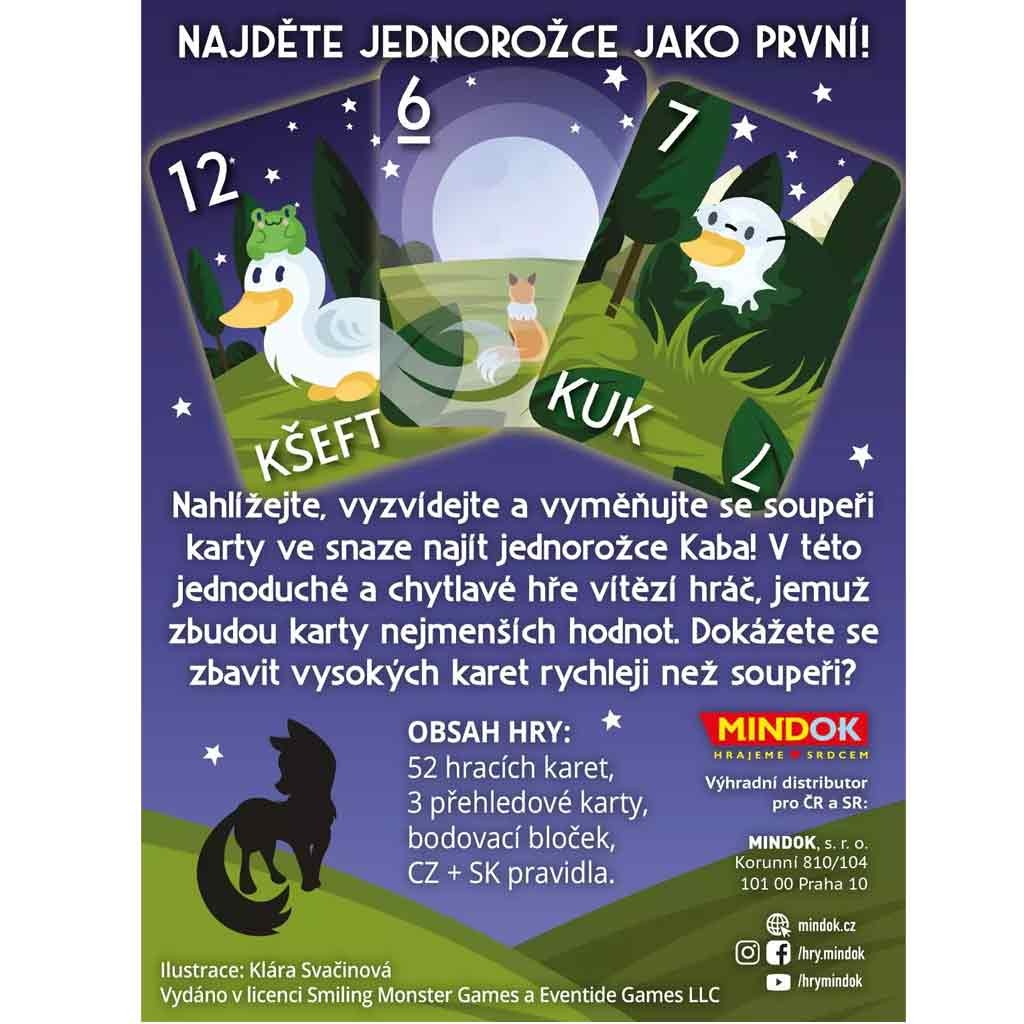 Nahlížejte, vyzvídejte a vyměňujte se soupeři karty ve snaze najít jednorožce Kaba! V této jednoduché a chytlavé hře vítězí hráč, jemuž zbydou karty nejmenších hodnot. Dokážete se zbavit vysokých karet rychleji než soupeři?