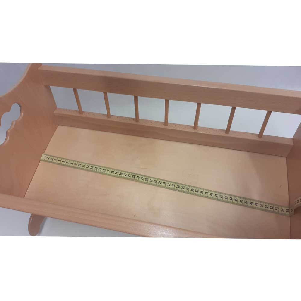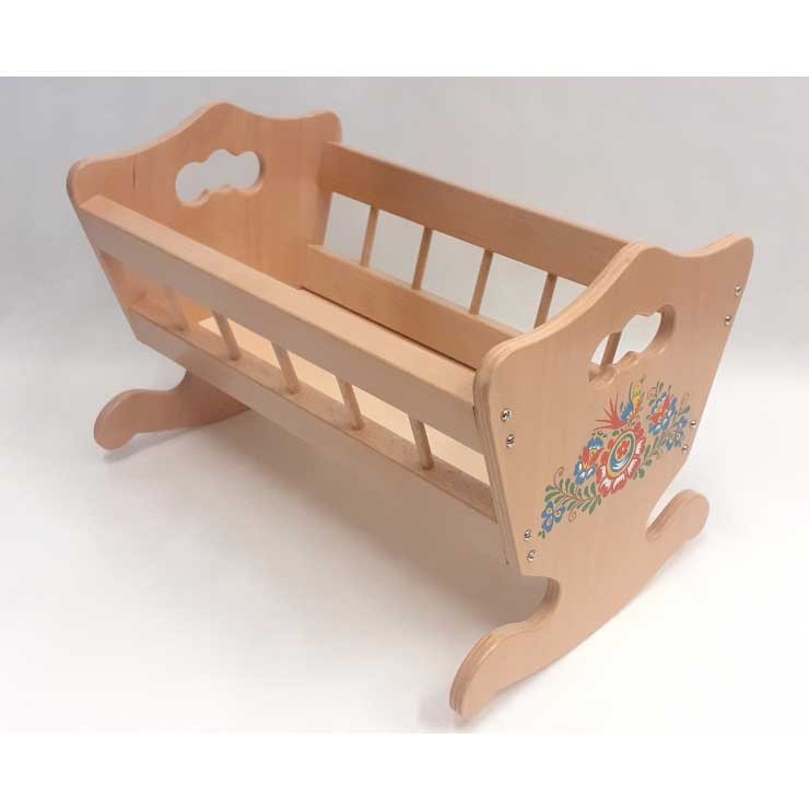 Dřevěná kolébka pro panenky vyrobená ručně v chráněné dílně.