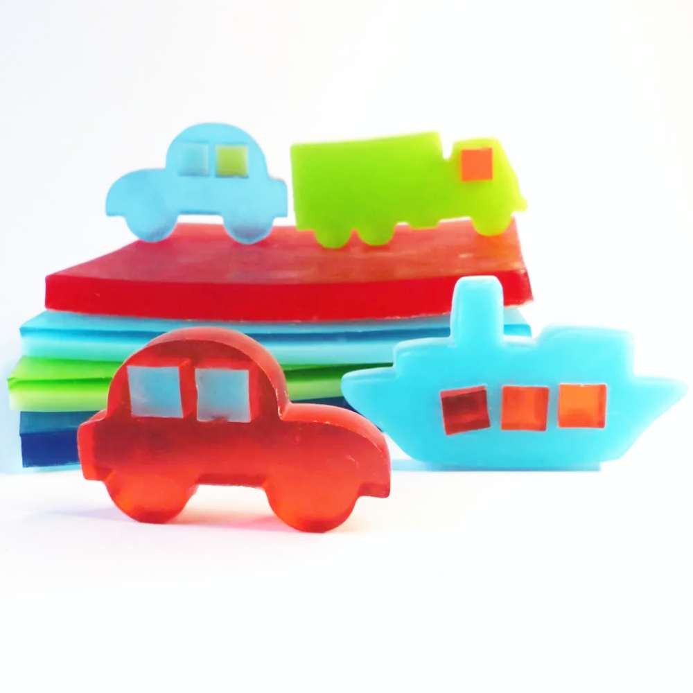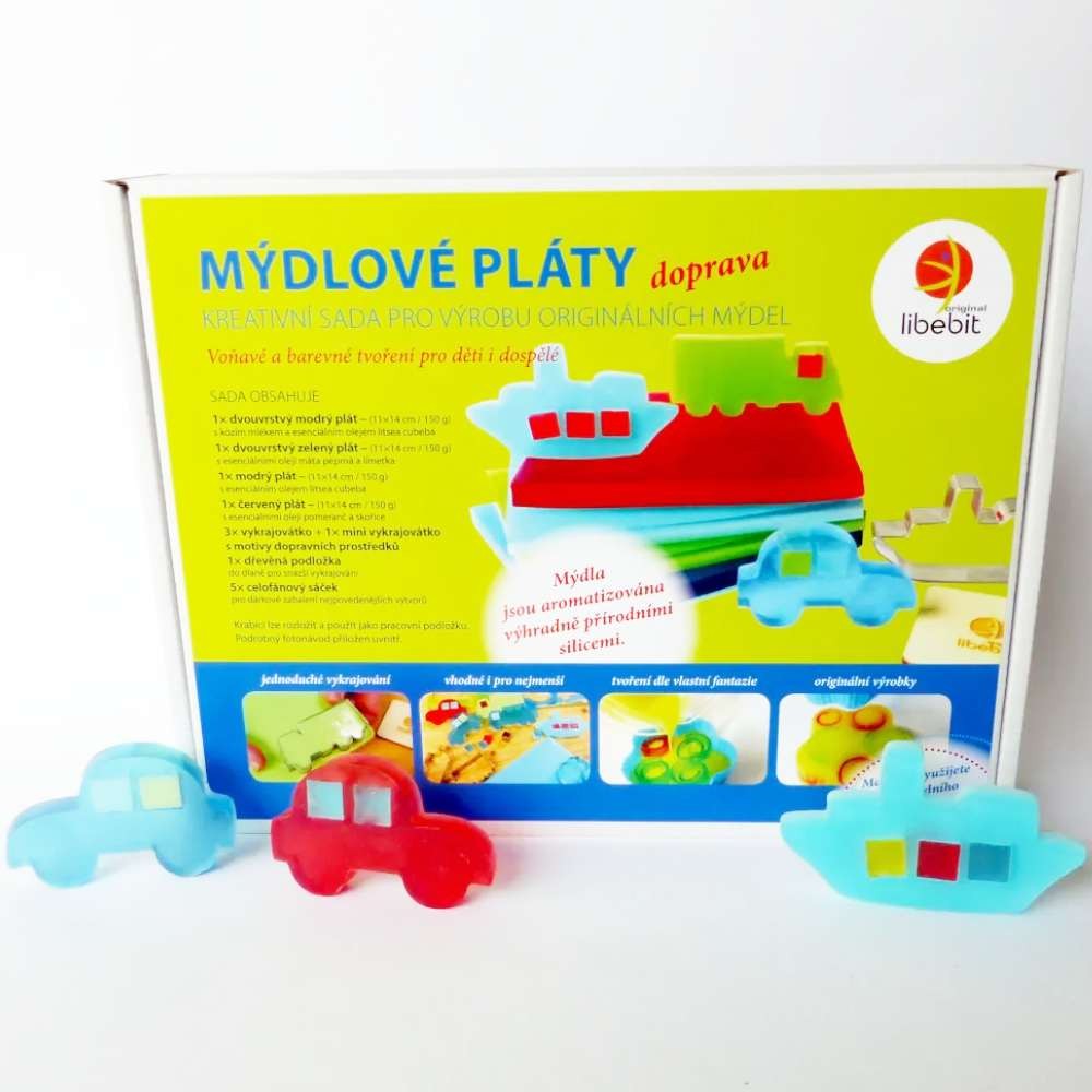 Výroba mýdla pro děti a milovníky aut, náklaďáků, lodí, prostě dopravních prostředků. Voňavé a barevné tvoření pro děti, pobaví i dospělé. Sada nabízí řadu možností mýdlového tvoření: jednoduché vykrajování mýdélek pro nejmenší, odlévání mýdel do formiček, různé kombinace obojího (např. zalévání odkrojků rozpuštěnými zbytky hmoty jiné barvy), ale i složitější tvoření dle vlastní fantazie, výrobu vrstvených mýdel či mýdlové mozaiky.