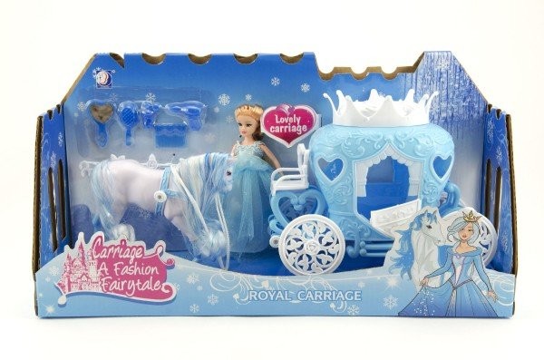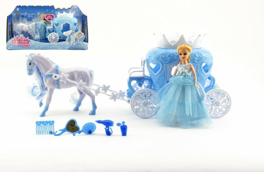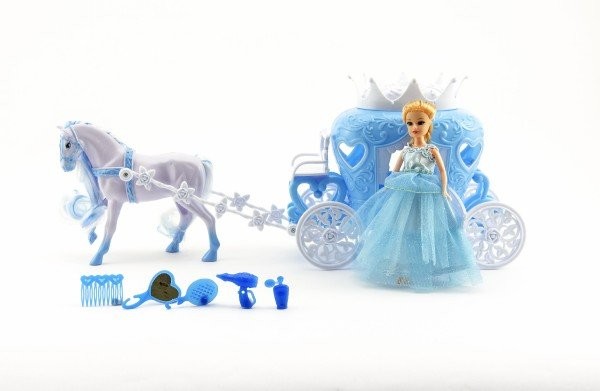 Kůň s kočárem a panenkou s doplňky. Princezna v dlouhých modrých šatech přijíždí za holčičkami v kočáře, do kterého je zapřažen bílý koník. Princezna má dlouhé blond vlasy, které si holčičky mohou rozčesat a využít doplňků, které s sebou princezna přiváží, k vytvoření nových účesů.