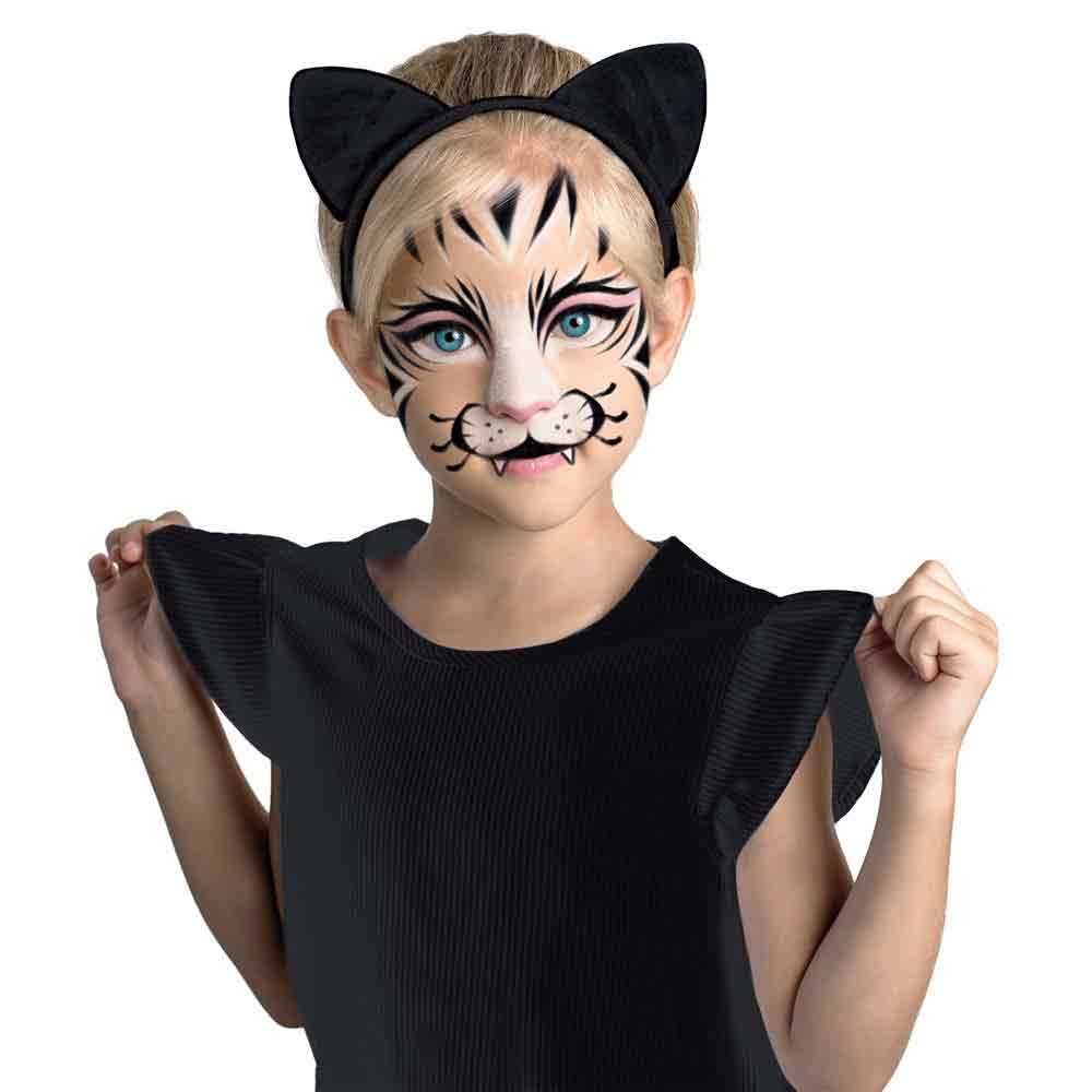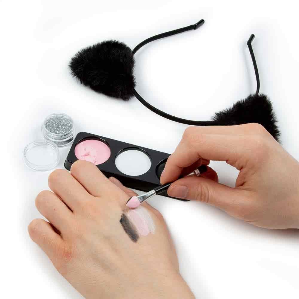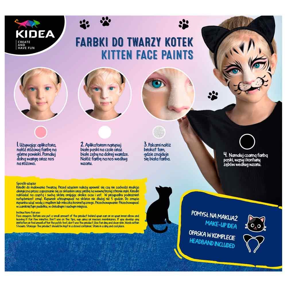 Barvy na obličej jsou snadno smývatelné, dobře kryjí, snadno se smíchají. Balení obsahuje barvy, štětec pro přesné nanesení, aplikátor, třpytky, čelenku s ušima a návod na make-up.