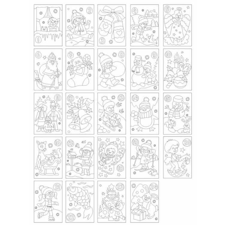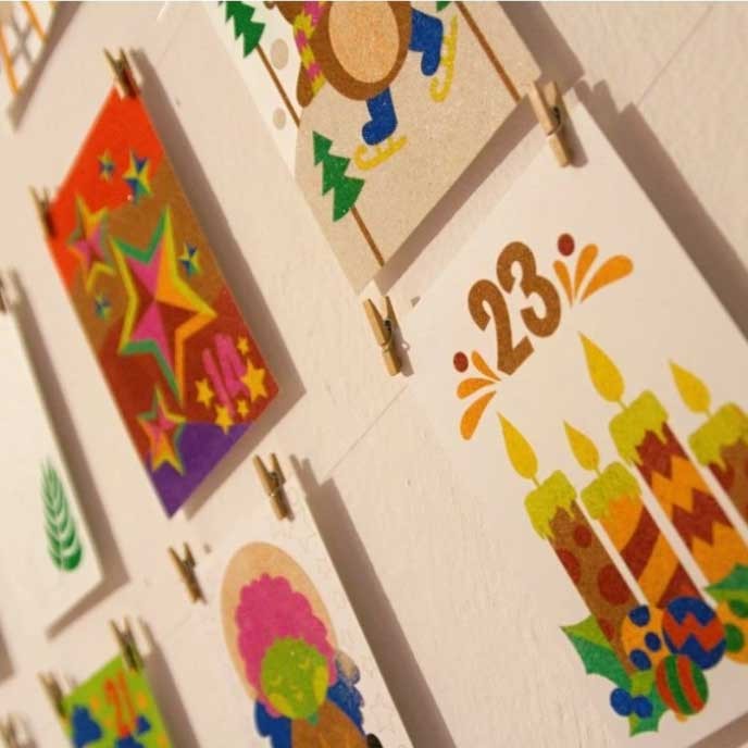 Závěsný adventní kalendář - vytvořili jsme unikátní sadu 24 obrázků nejen pro děti. Vypískujte si od 1. prosince do Štědrého dne jeden ojedinělý obrázek. V sadě najdete závěsné očka, která se přilepí na zeď, do oček se natáhne přiložený silon a můžete si vystavit všech 24 obrázků díky klamérek, které drží každý obrázek.