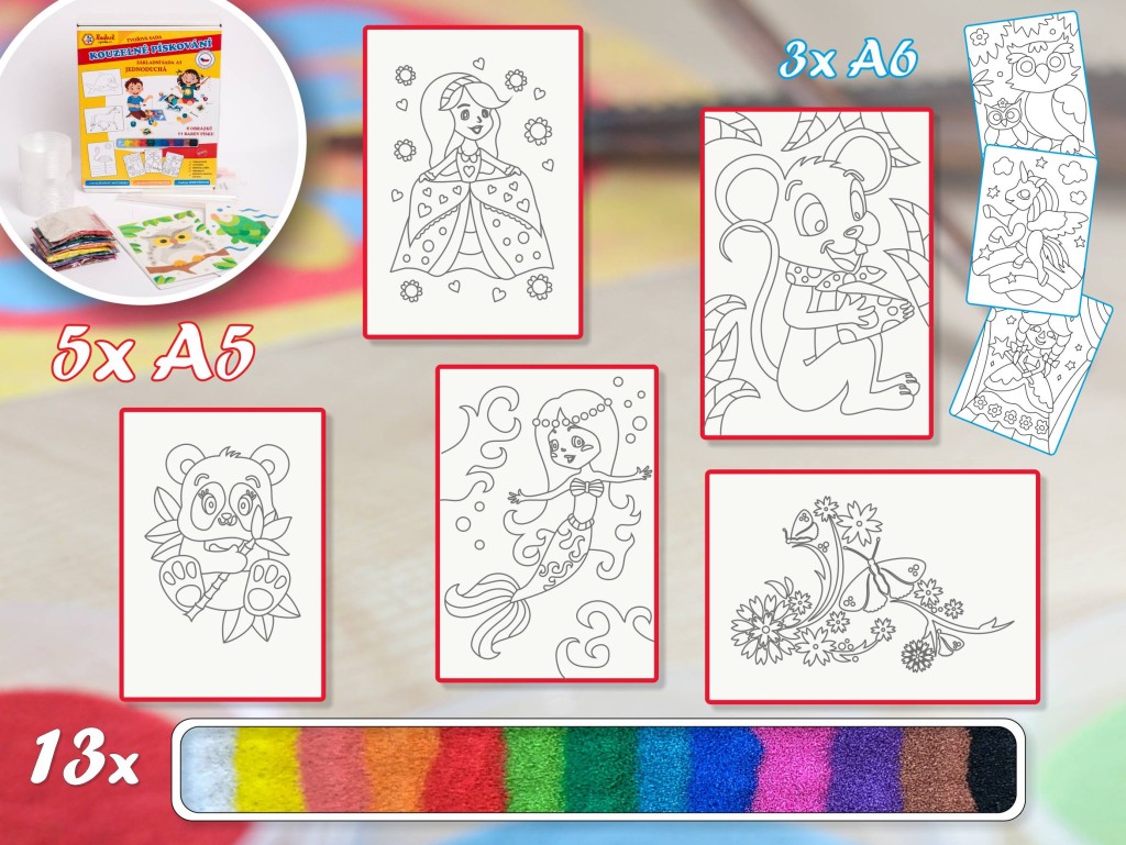 Hledáte kreativní a smysluplný dárek pro děti? Tato střední sada na pískování obrázků je navržená speciálně pro malé výtvarnice, které milují barvy, tvoření a originální obrázky. Malování pískem je snadné, zábavné a krásně rozvíjí dětskou kreativitu.