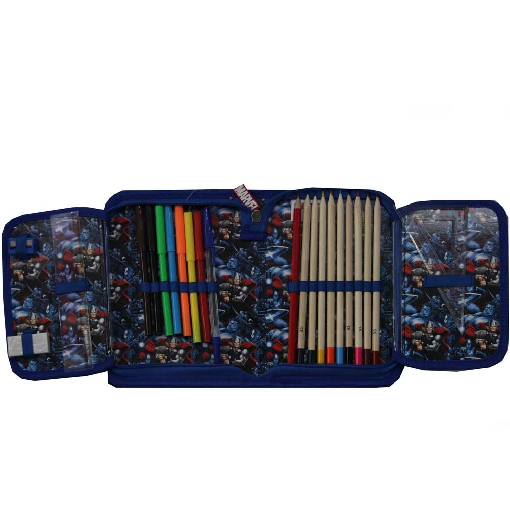 Jednopatrový školní penál se 2 klopami, vybavený obsahuje 22 gumových poutek pro uchycení psacích potřeb. Na vnitřních chlopních jsou průhledné fólie pro rozvrh hodin. Penál je potištěn motivem hrdinů z filmu Avengers i uvnitř.