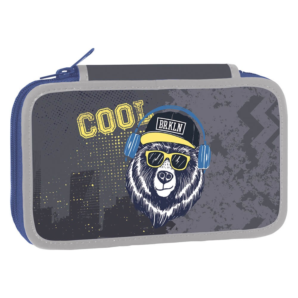 Chlapecký školní penál Cool Bear dvoupatrový s motivem medvěda. Každé jednotlivé patro se uzavírá na samostatný zip. Jedno patro má 13 gumových poutek, z toho jsou 2 větší na gumu a ořezávátko, a kapsičku na druk. Druhé patro má průhlednou kapsičku na rozvrh hodin a 10 gumových poutek. Penál je nevybavený.