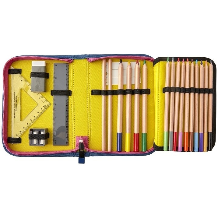Náplň: 2 tužky, 10 pastelek, 4 široké pastelky, guma na gumování, ořezávátko, 2 pravítka.