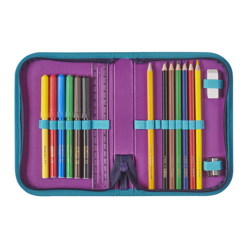 Obsahuje: 8 pastelek, 14 fixů, kuličkové pero, 2 tužky, gumu, ořezávátko, pravítko 17 cm, trojúhelník a rozvrh hodin