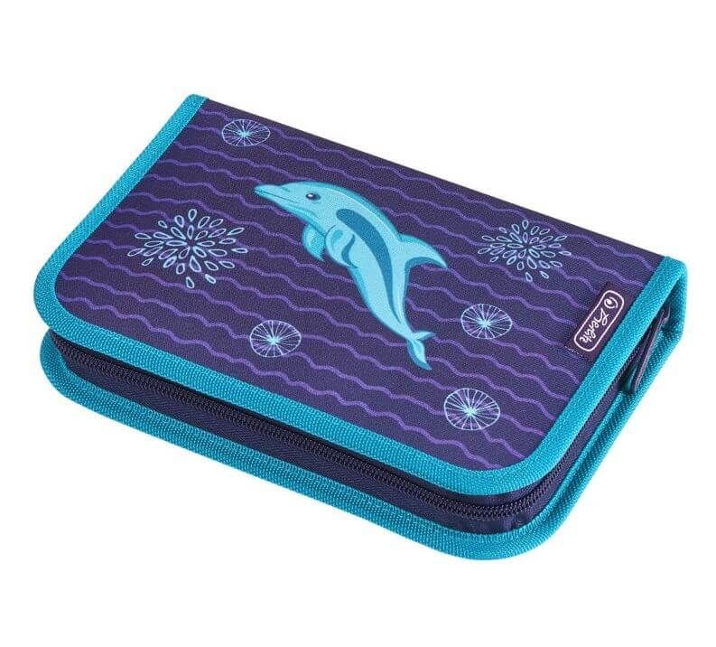 Vybavený školní penál se dvěma klopami a psacími potřebami značky Herlitz. Na obou stranách klopy je folie pro umístění rozvrhu.