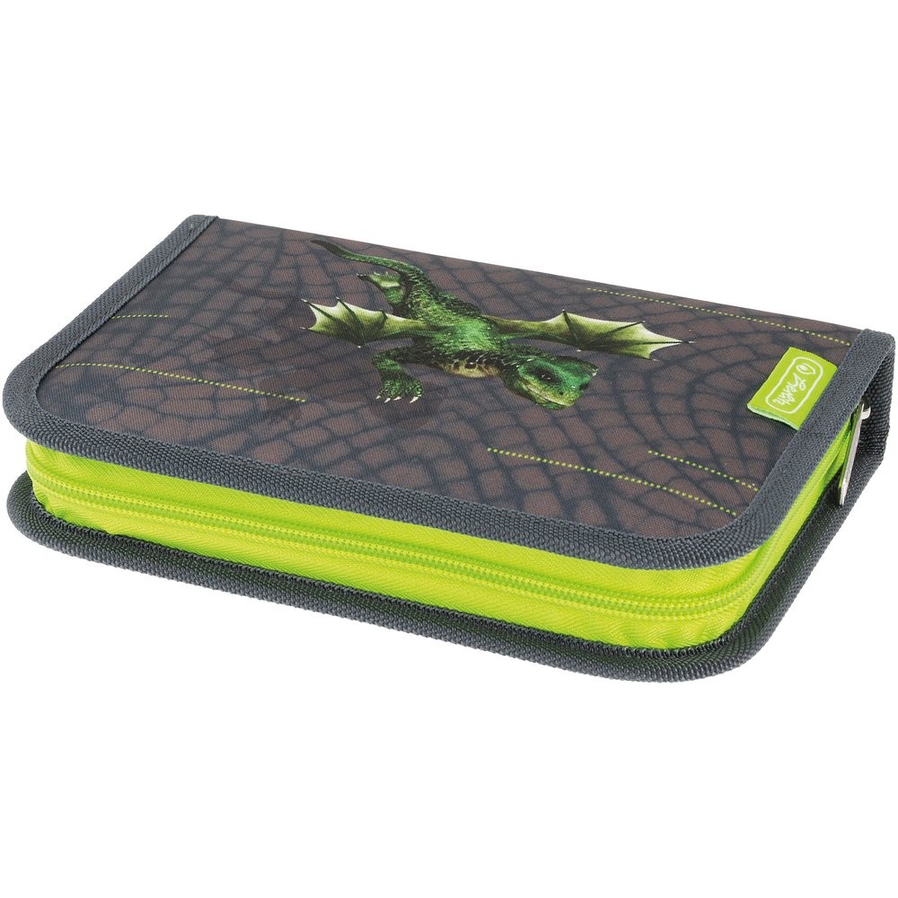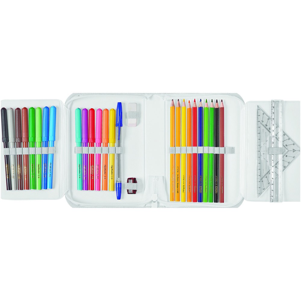 Školní penál vybavený se dvěmi klopami. Obsahuje 14 fixů, 8 šestihranných pastelek, 2 tužky, ořezávátko, gumu, 16cm pravítko, trojúhelník a kuličkové pero. Na rubu klopy je fólie pro rozvrh hodin.
