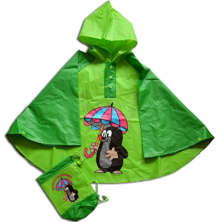 Dětské pončo do deště s motivem Krteček v zelené barvě. Součástí ponča je i pytlíček na uložení. Vyrobeno z materiálu PEVA, jehož výhodou je nižší hmotnost oproti PVC, odolnost proti nižším teplotám a recyklovatelnost.