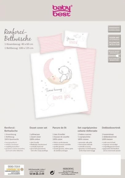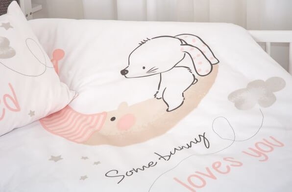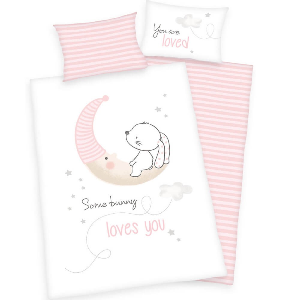 Kvalitní oboustranné bavlněné povlečení do postýlky s motivem roztomilého zajíčka. Balení obsahuje povlak na peřinu (100 x 135 cm) a polštář (40 x 60 cm). Povlak na přikrývku má zapínání na zip, u povlaku na polštář je řešeno zapínání založením látky.