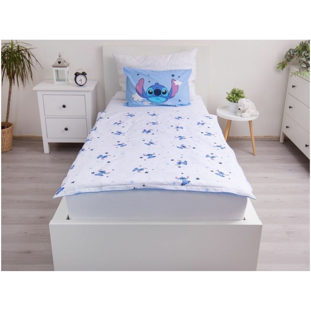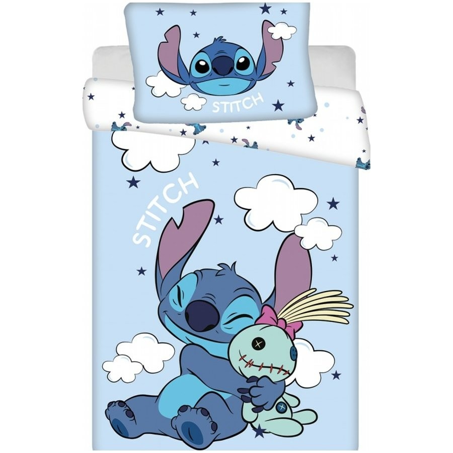 Povlečení do postýlky Stitch Clouds baby z jemné 100% bavlny. Rozměr 100×135 cm + 40×60 cm, zapínání na zip. Roztomilý motiv Stitch mezi obláčky pro klidný spánek nejmenších!