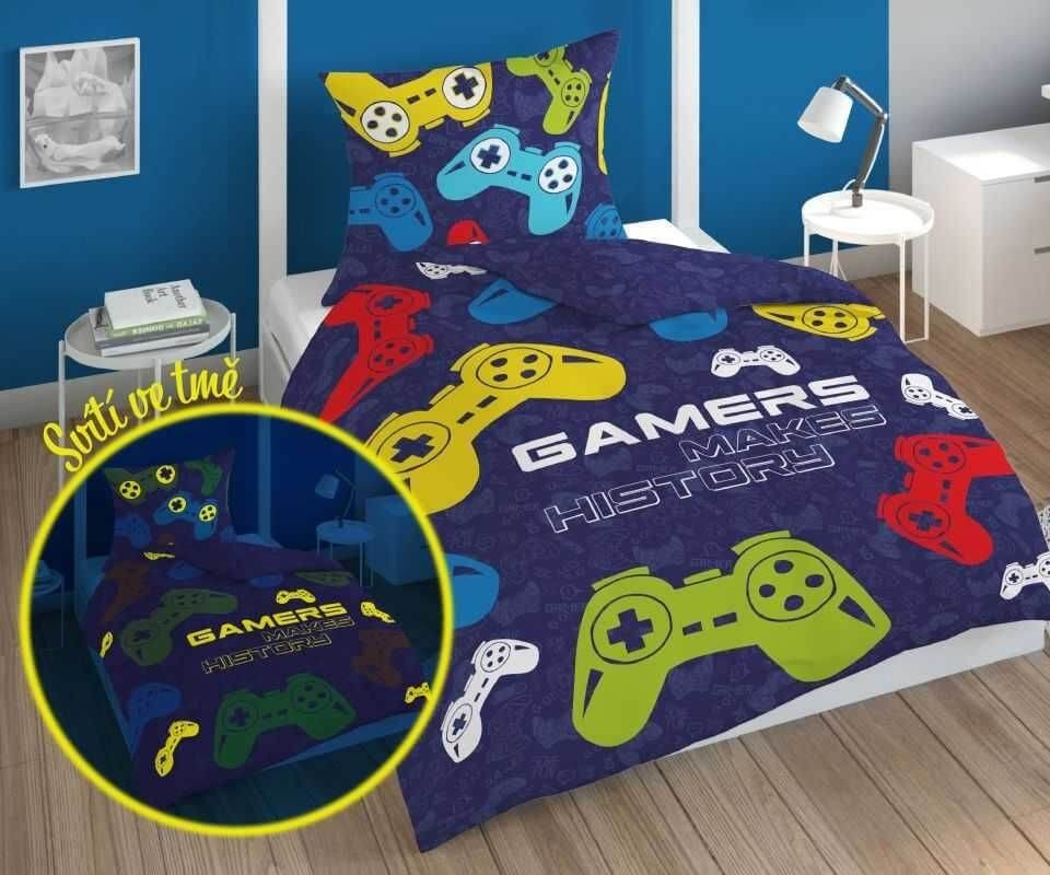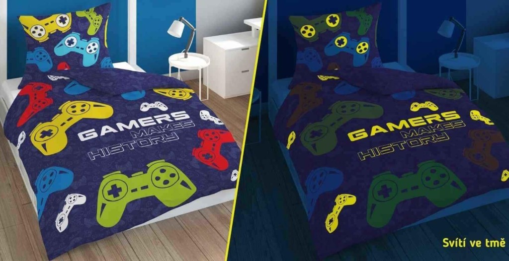 Bavlněné povlečení na velkou postel s motivem herních konzolí. Dětské povlečení má z každé strany jiný motiv a zapínání na zip. Povlečení svítí ve tmě po nasvícení na denním světle, svítící efekt se může začít vytrácet po 5 vypráních, možno prát na 40°C.