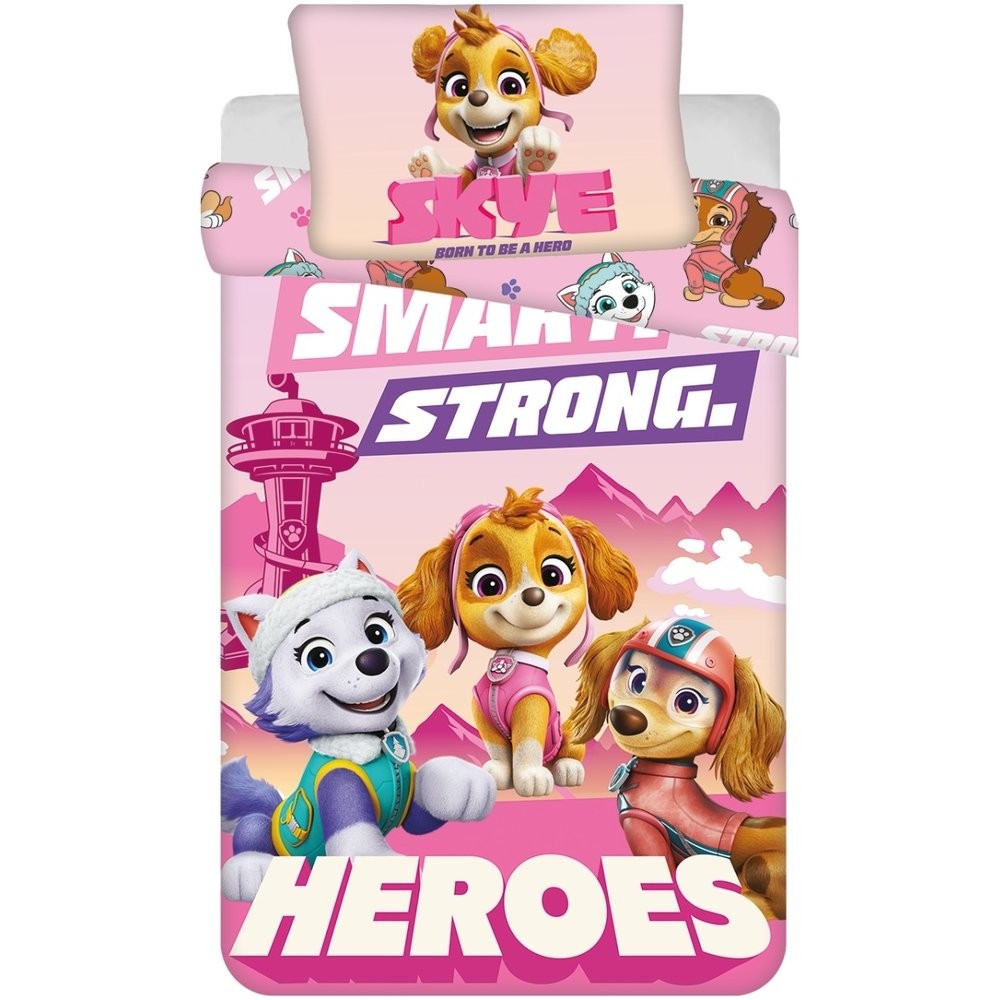 Dětské povlečení 100x135 Paw Patrol 558 s motivem Skye a Everest. Růžový design s nápisy „SMART“, „STRONG“, „HEROES“ – ideální pro malé hrdinky Tlapkové patroly! Rozměr povlečení je 40x60, 100x135 cm.