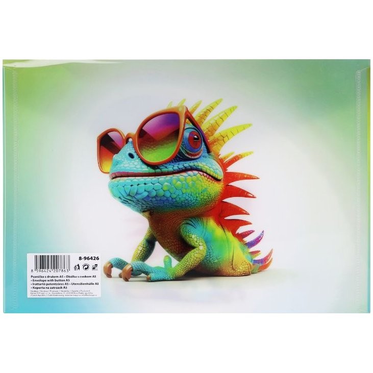 Obálka s drukem A5 Chameleon ve tvaru psaníčka na dokumenty s veselým motivem. Vyrobeno z odolného polypropylenu (200 mic), který chrání obsah před poškozením. Praktické uzavírání na druk zajistí bezpečné uložení. Ideální pro přenos a uspořádání pracovních listů formátu A5 i drobných pomůcek, jako je pravítko. Perfektní doplněk pro každého malého školáka.