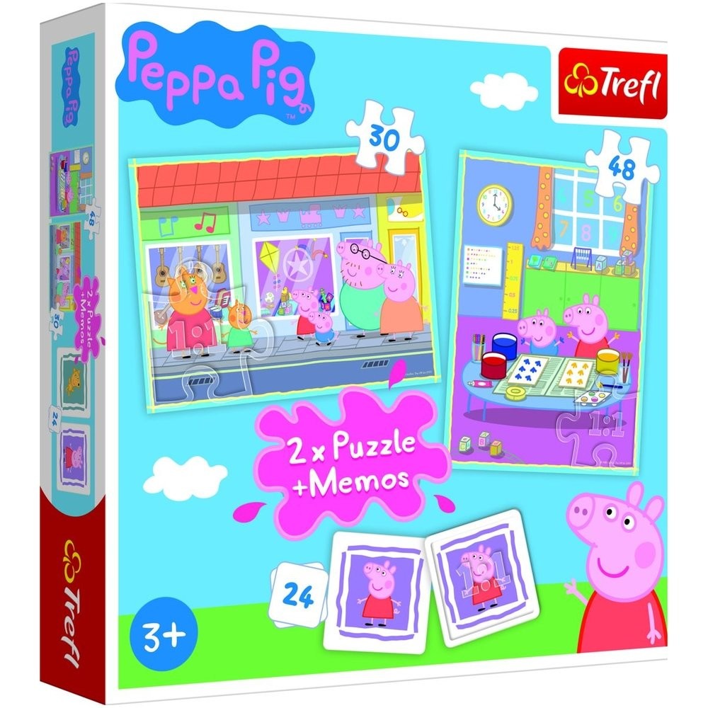 Dvě puzzle pro děti s 30 a 48 dílky v jedné krabičce s motivem Prasátka Peppy. Balení obsahuje také pexeso 24 dílků.