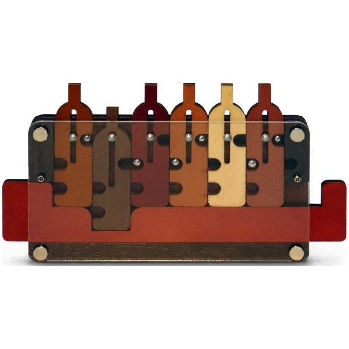 Posouvejte dřevěné láhve nahoru a dolů tak, abyste postupně vysunuli zásobník. Láhve musíte šikovně přesunovat, odemykat nebo zamykat pomocí kuliček, které drží láhve na svém místě. Naprosto originální dřevěný hlavolam, který jistě potěší každého, nejen vinaře.