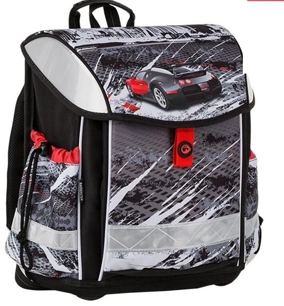 Jednokomorová školní aktovka s motivem sportovního auta v nočním městě, vhodná pro menší prvňáčky.