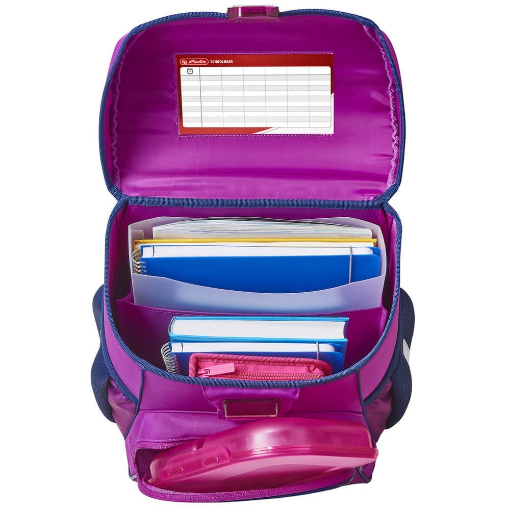 Vybavený školní penál se dvěma klopami a psacími potřebami značky Herlitz. Na obou stranách klopy je folie pro umístění rozvrhu.