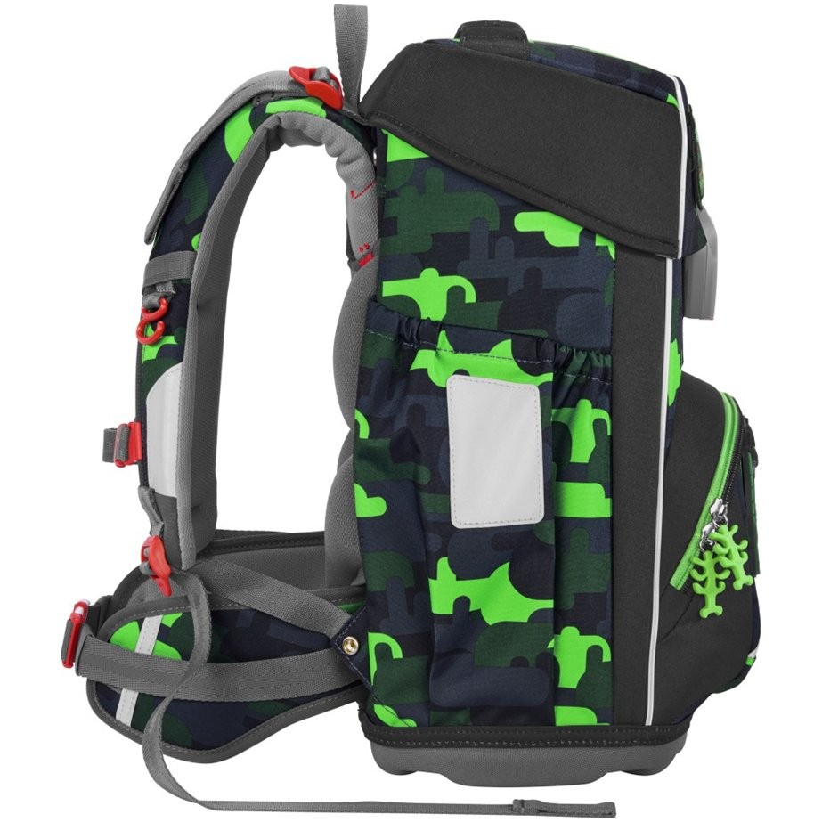 Přední kapsa s termoizolační vrstvou a odtokovými otvory, otevřené boční kapsy rostoucí směrem ven s odtokovými otvory, polstrovaná rukojeť a poutko na zavěšení. Aktovka se uzavírá na magnetický uzávěr FIDLOCK. Hlavní kapsa s vnitřní kapsou jsou vhodné pro těžší předměty (knížky, desky na sešity) a gumičky v klopě pro úsporné uložení penálu. Taška do školy má voděodolné pevné dno, reflexní prvky pro větší bezpečnost v silničním provozu a je vyrobena z odolného a vodoodpudivého materiálu. Použitá impregnace je bez PFC a textilie jsou vyrobeny ze 100% recyklovaných PET lahví.