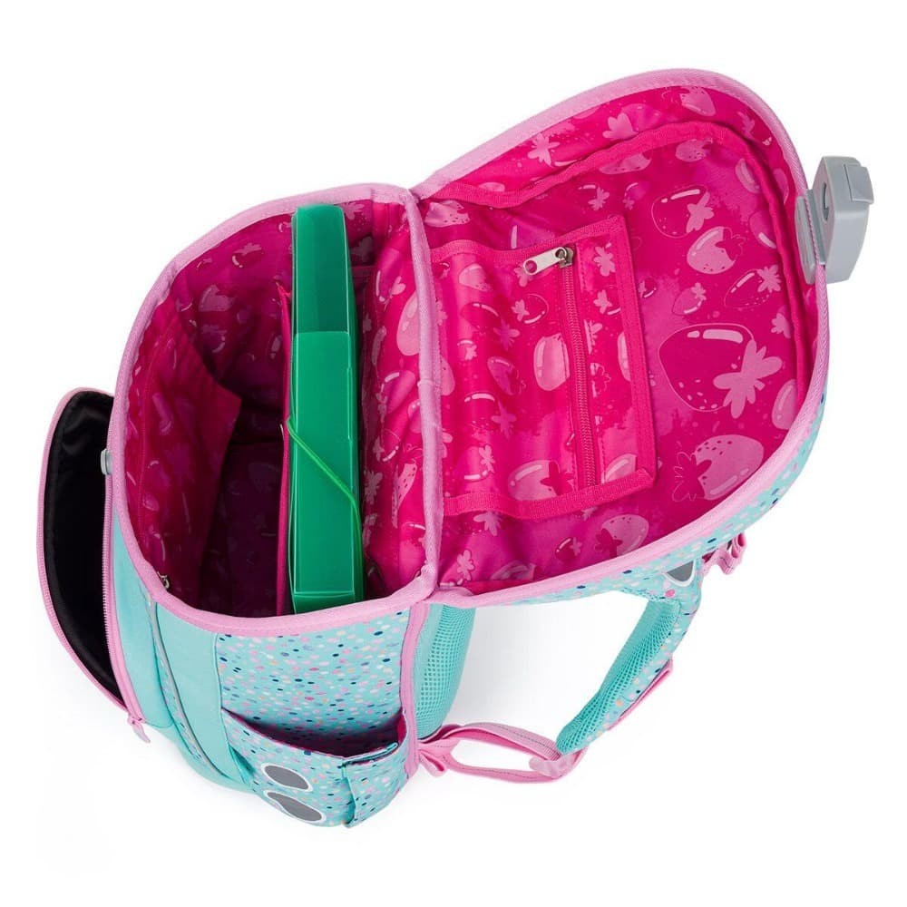 V objemné hlavní kapse najdete organizér, dvě malé kapsy na drobnosti a jmenovku. Po stranách jsou dvě pevné kapsy na lahev na pití o objemu 0,5 litru. V přední kapse je odnímatelná karabina na klíče, skvěle se tam vejde také penál ve stejném designu, nebo krabička na svačinu.