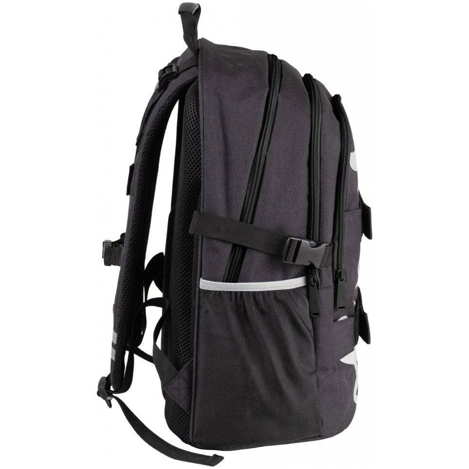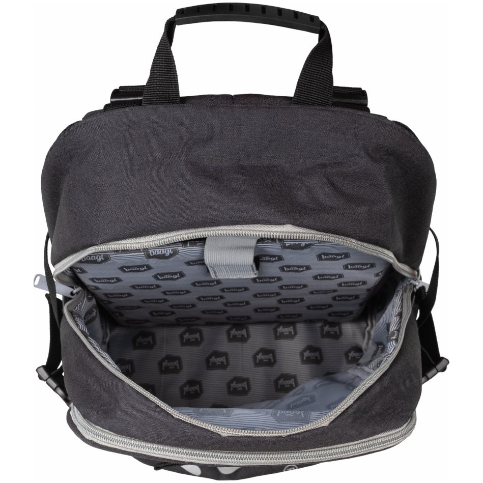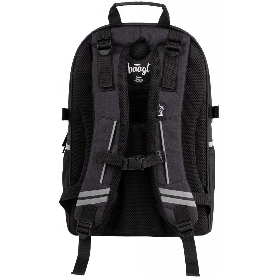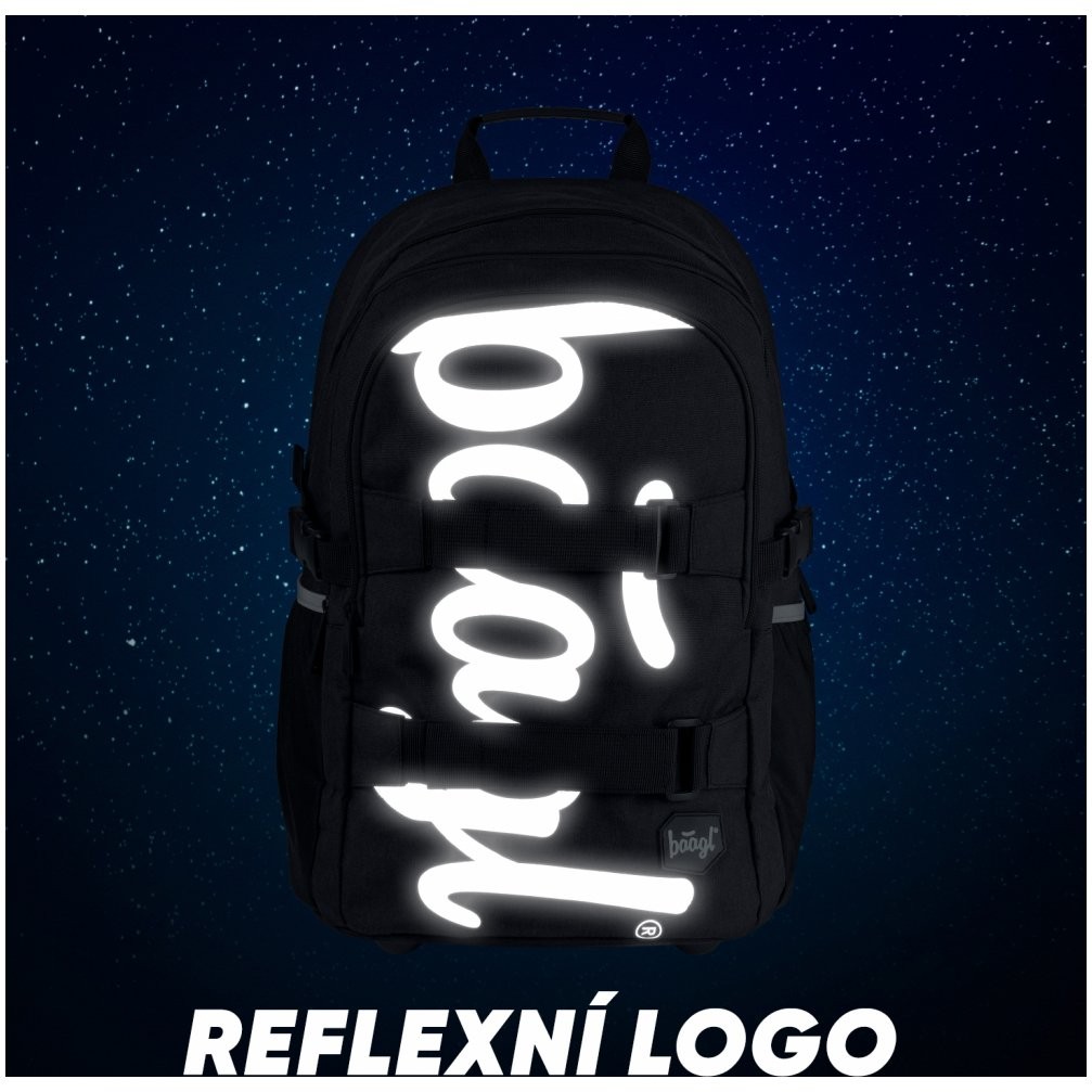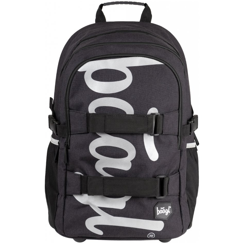 Dvoukomorový školni batoh Skate Black s reflexním logem Baagl na přední zipové kapse vhodný jako druhý batoh - ideálně od 3. třídy ZŠ a výše. Batoh má anatomicky tvarovaná, měkce polstrovaná záda i ramenní popruhy.