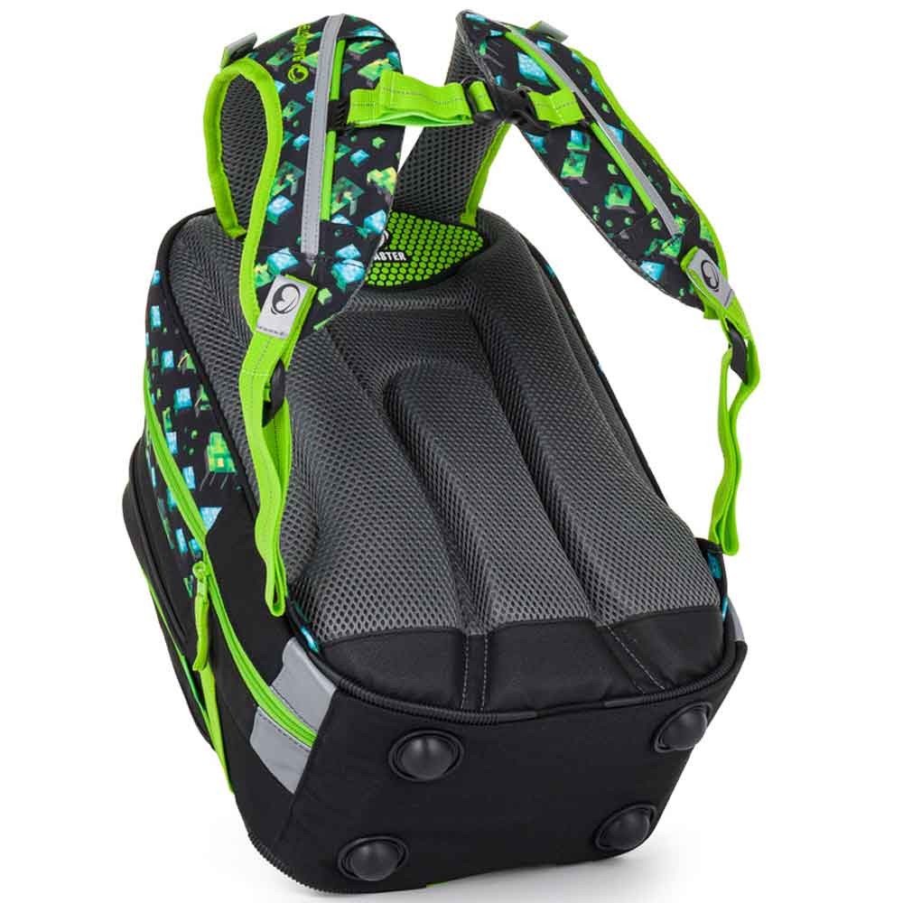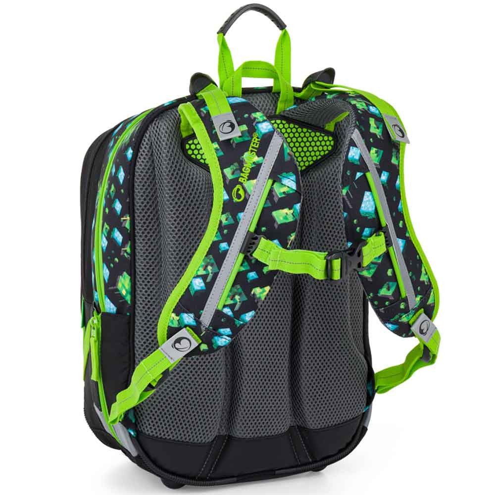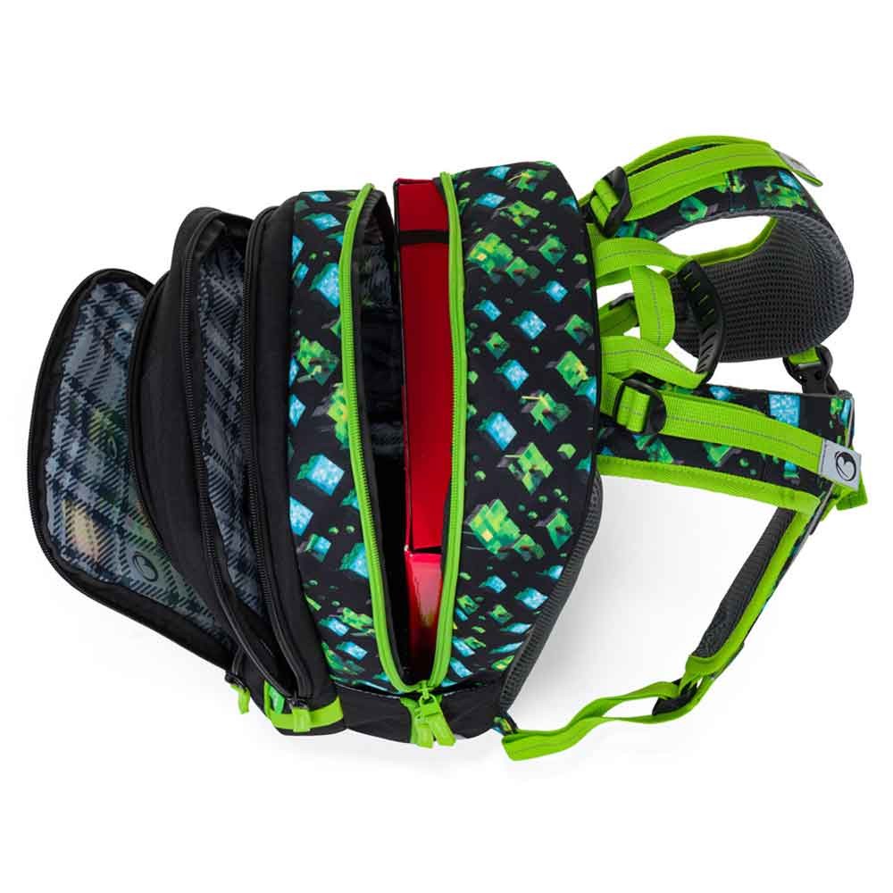 Hlavní komora batohu je určena k přehlednému uložení školních desek a dalších učebnic. Další dvě komory jsou vhodné na ostatní školní potřeby a svačinový box, prostřední komora je navíc opatřena organizérem. Batoh má ergonomicky tvarovaný polstrovaný zádový systém se zdravotním posudkem, který je doplněn lehkým hliníkovým rámem pro podporu správného držení těla. Polstrované ramenní popruhy pro ideální nastavení batohu jsou opatřeny hrudním pásem. Dno batohu má plastové nožky sloužící proti jeho oděru.
