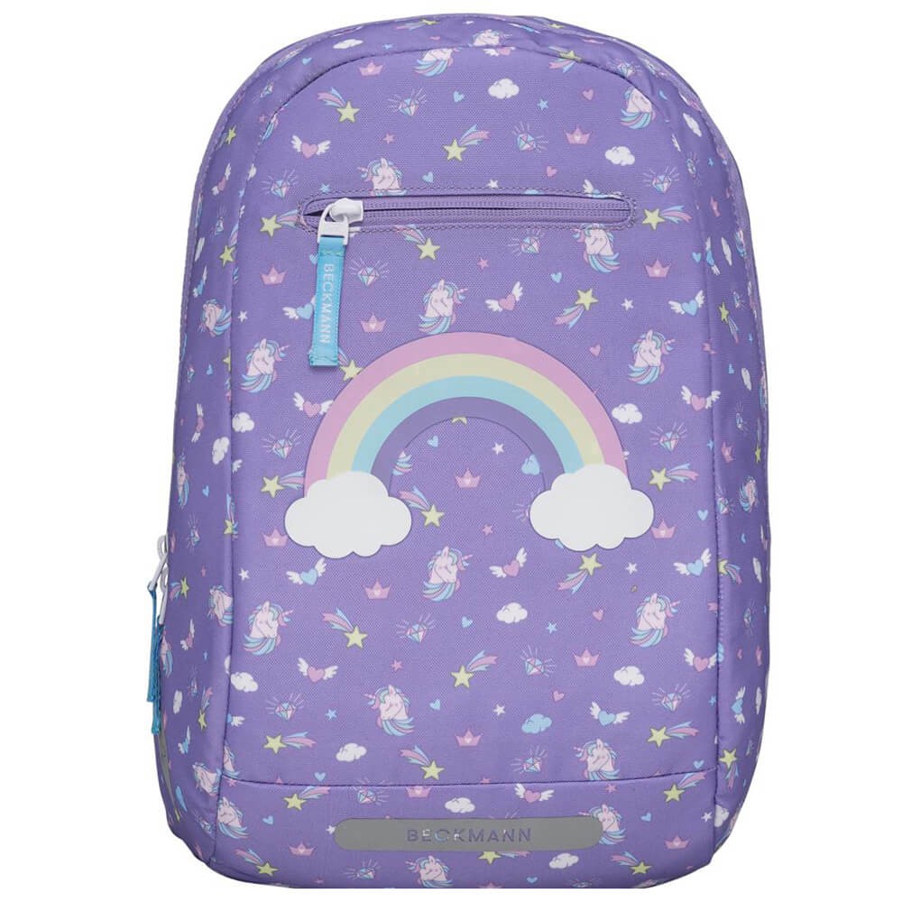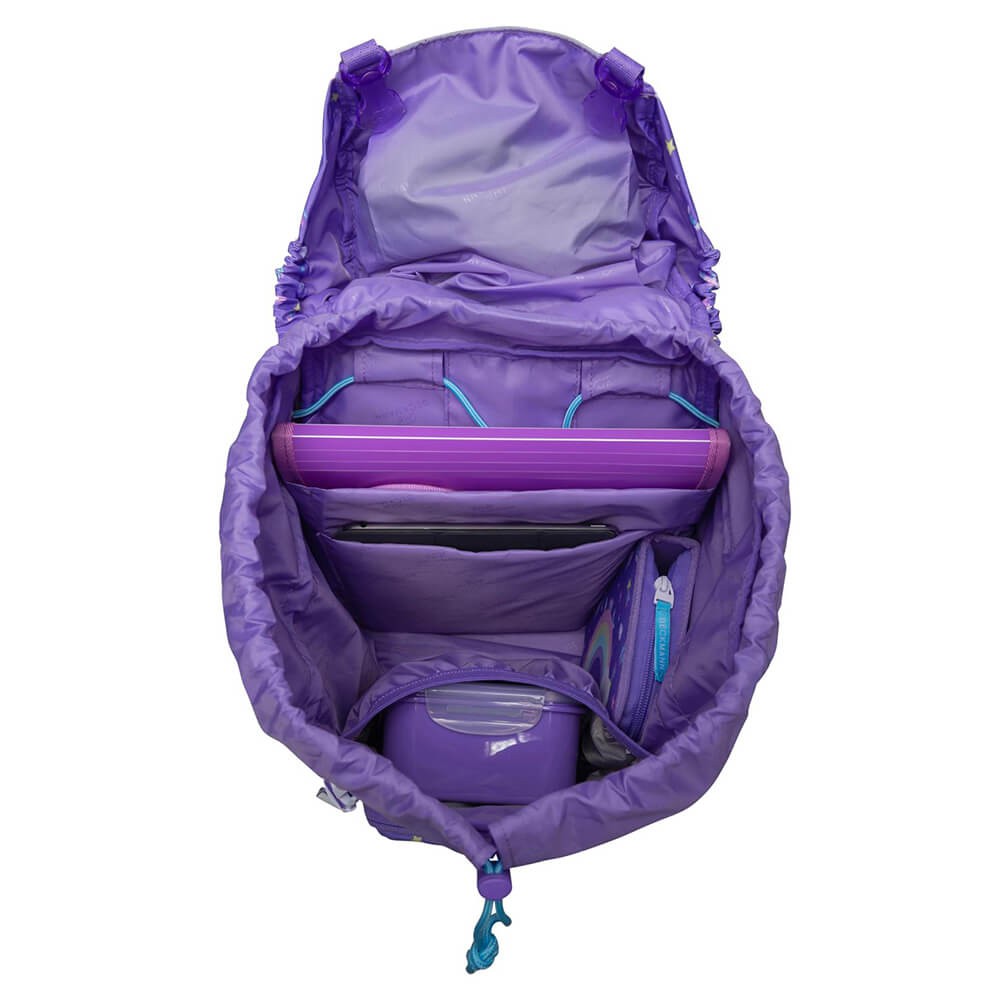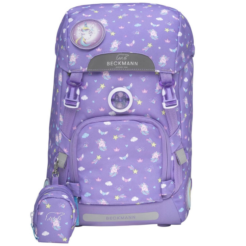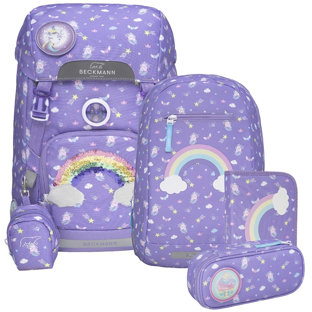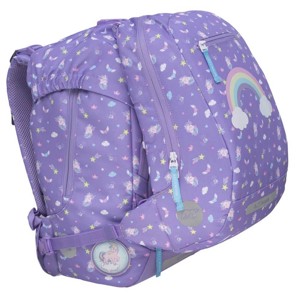 Školní batoh Beckmann je vhodný pro prvňáčky až třetí třídu základní školy. Jedinečný design na fialovém pokladu zdobí flitrový obrázek duhy na přední kapse. Dá se ale zakrýt, přední kapsa je na modelech 2020 otáčecí. Jednokomorový batoh s vnitřním členěním a objemem 22l nabízí celou škálu vychytávek, zde v přehledném popisu: