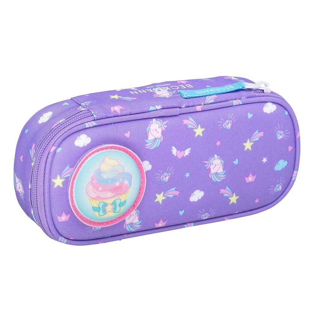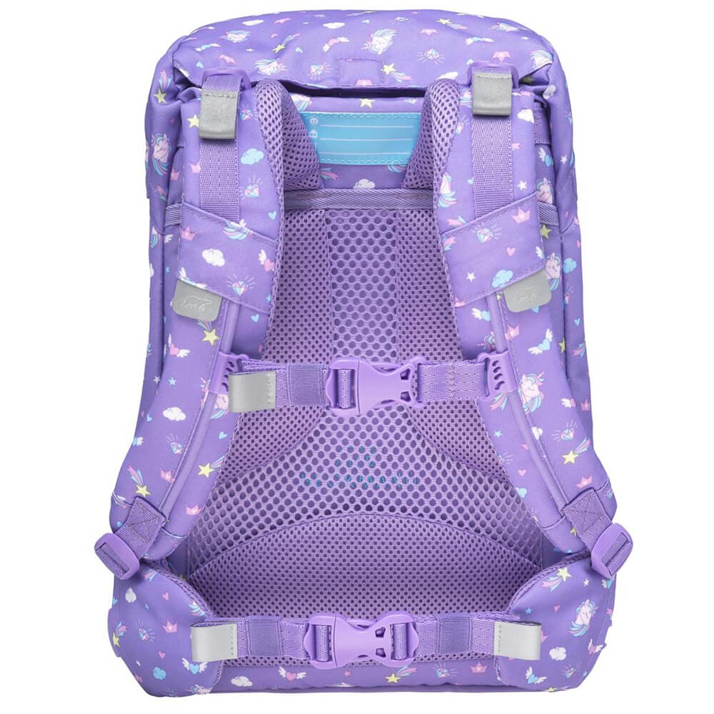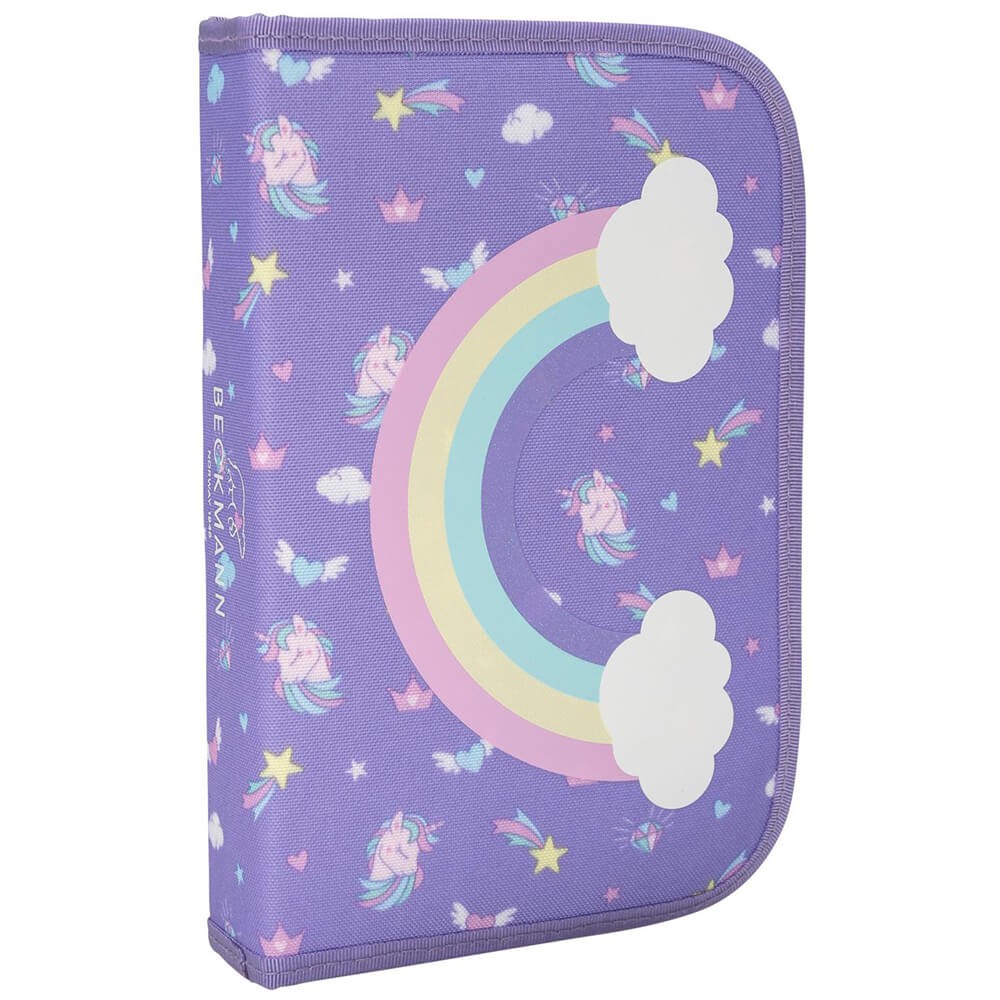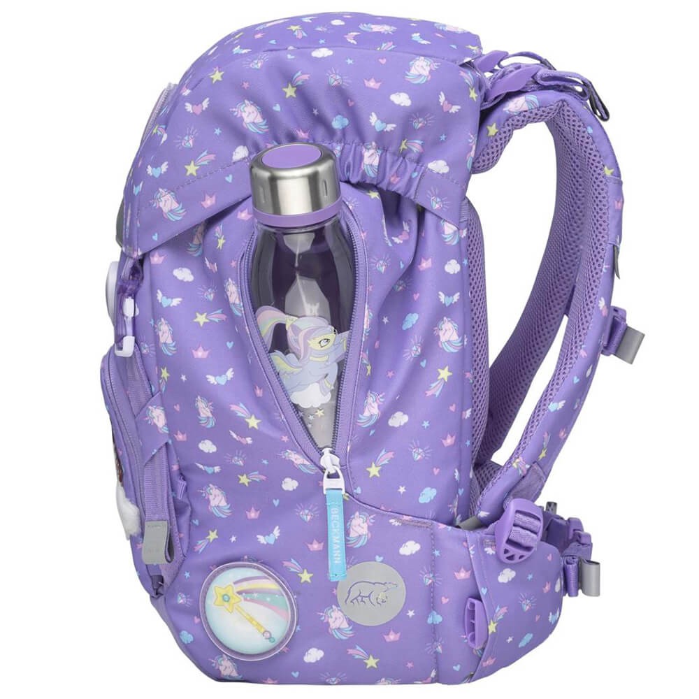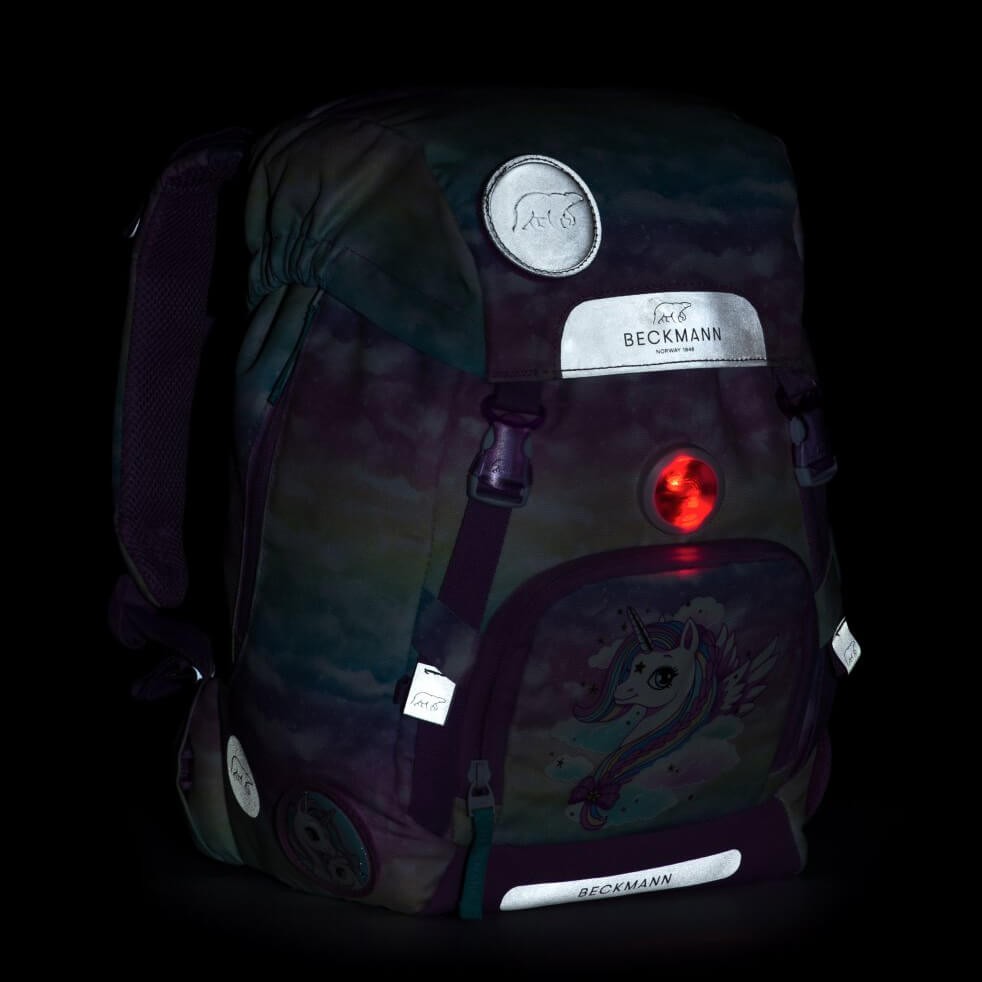 Školní batoh Beckmann je vhodný pro prvňáčky až třetí třídu základní školy. Jedinečný design na fialovém pokladu zdobí flitrový obrázek duhy na přední kapse. Dá se ale zakrýt, přední kapsa je na modelech 2020 otáčecí. Jednokomorový batoh s vnitřním členěním a objemem 22l nabízí celou škálu vychytávek, zde v přehledném popisu: