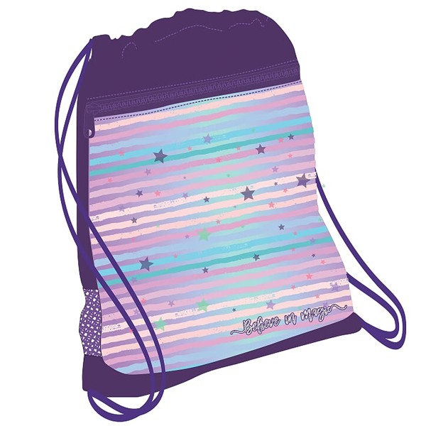 Pytlík na přezůvky nebo na tělesnou výchovu. Obsahuje 2 přihrádky. Hlavní přihrádka se dá stáhnout pomocí šňůrky, další má na zip. Díky vzadu přidané síťovině je zajištěno správné proudění vzduchu a větrání. Je vyroben z odolných materiálů. Může se nosit v ruce nebo jako vak na zádech.