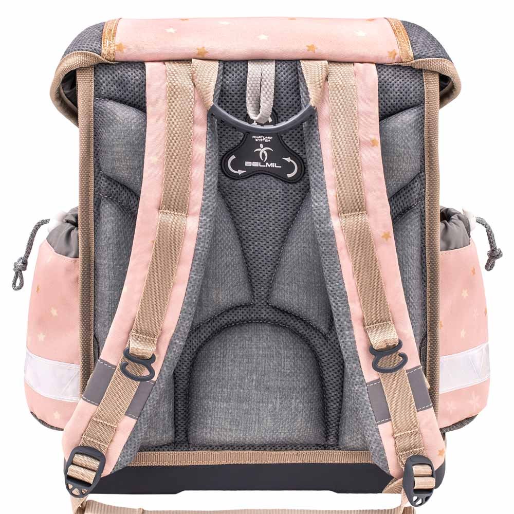 Stabilní a lehká školní aktovka Belmil vyrobená z kvalitního nepromokavého materiálu s ergonomicky tvarovanou a polstrovanou zádovou částí.