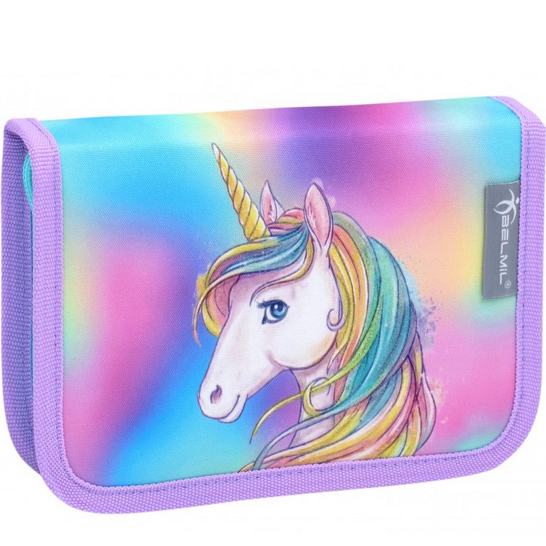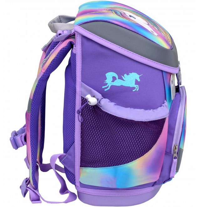 Lehká školní taška Belmil s něžným, duhovým motivem jednorožce vhodná pro drobné děti od 1. do 3. třídy ZŠ. Set se skládá z aktovky, penálu a sáčku na přezůvky stejného motivu. Praktickým doplňkěm je i reflexní přívěšek ve tvaru srdíčka.