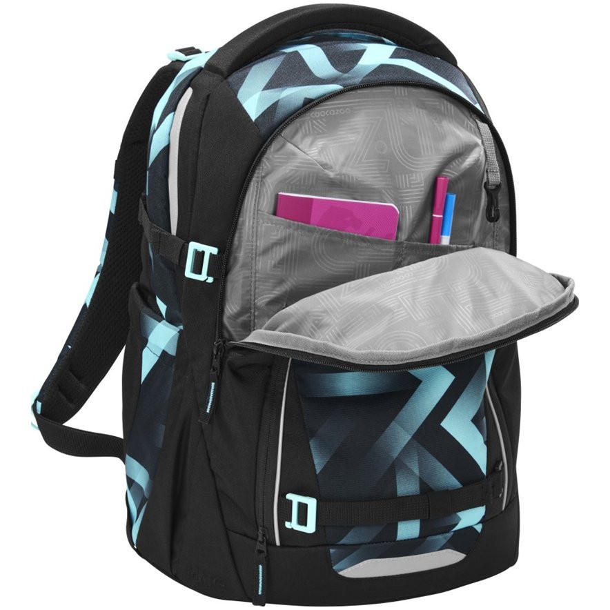 Batoh do školy má též odnímatelné stahovací řemínky pro stažení obsahu více k zádům, odnímatelné upevňovací popruhy na přední straně batohu pro připevnění bundy, helmy nebo třeba skateboardu, odnímatelný bederní pás s funkcí Pull-Forward (utažení dopředu), dvě otevřené boční kapsy rostoucí směrem ven, polstrovaná rukojeť, poutko na zavěšení a tři kapsy pro všechny školní potřeby.