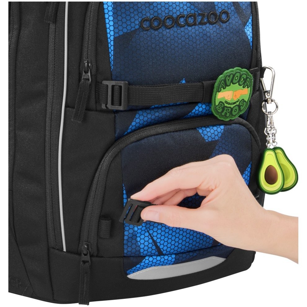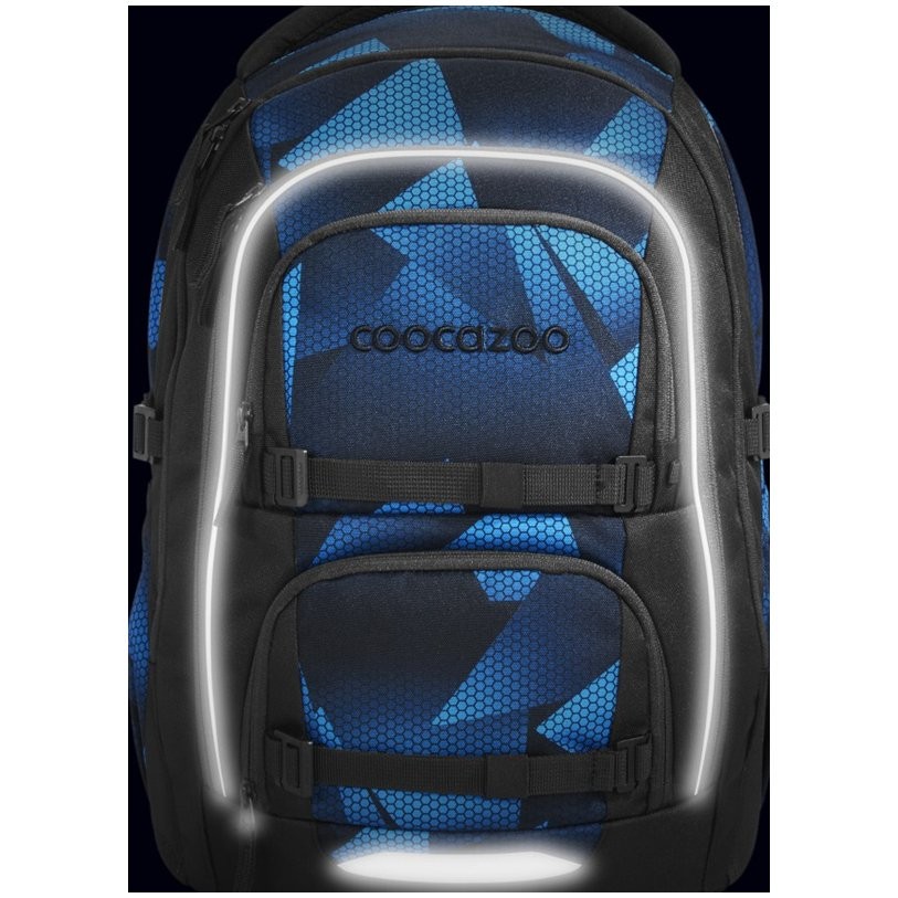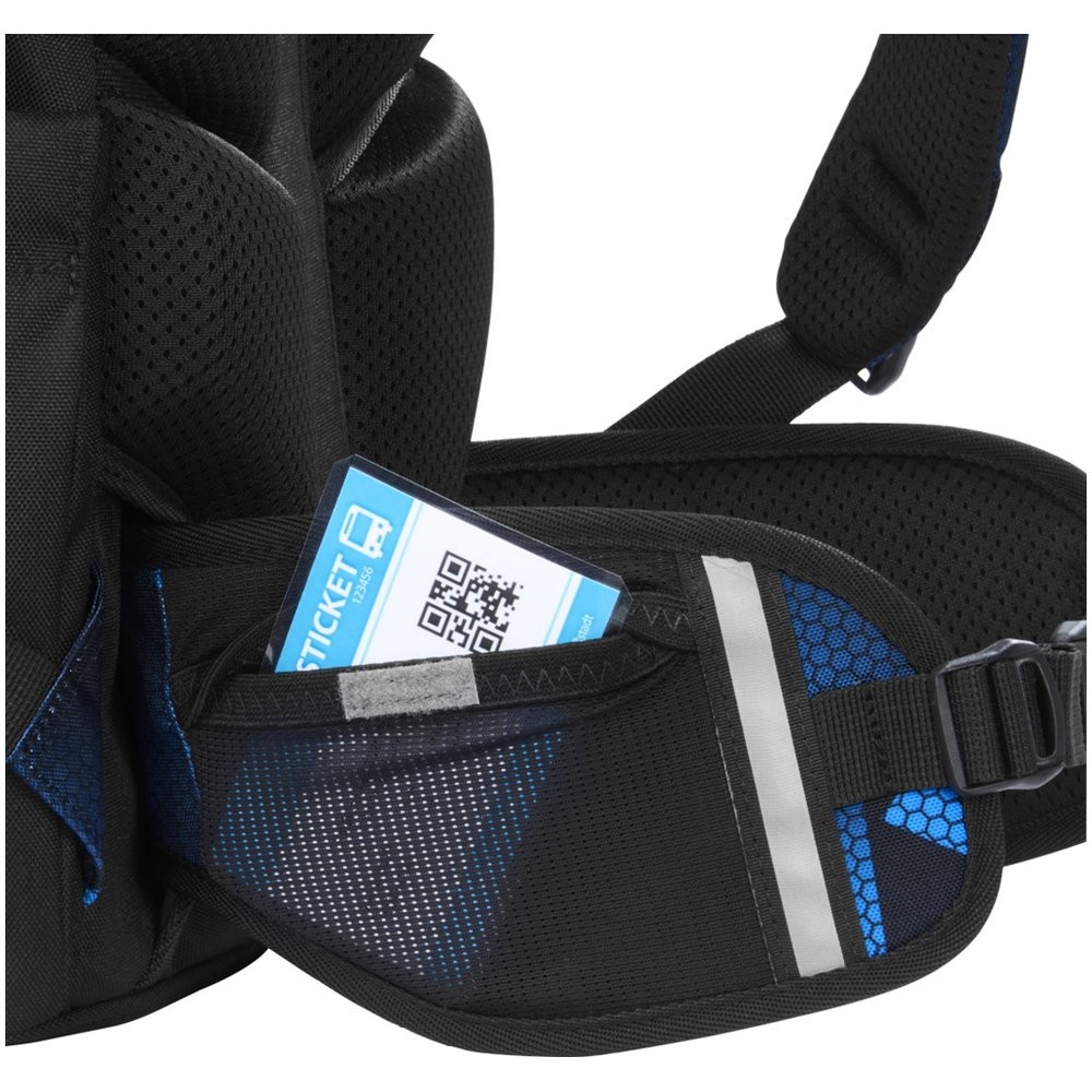 Malá síťovaná kapsa na bederním pásu, dvě otevřené boční kapsy rostoucí směrem ven, polstrovaná rukojeť a poutko na zavěšení a pět kapes pro všechny školní potřeby. Hlavní kapsa s přihrádkou na knihy a odnímatelnou přepážkou, velká kapsa, kapsa s organizérem a dvě malé přední kapsy např. pro svačinovou krabičku a drobné osobní věci a možnost připevnění organizéru na tablet uvnitř hlavní kapsy (prodává se samostatně). Extra velký přístup do hlavní kapsy pro lepší přehled, stabilní pevné dno, reflexní prvky pro větší bezpečnost v silničním provozu, v šeru a ve tmě a možnost připevnění LED blikačky pro ještě větší viditelnost.