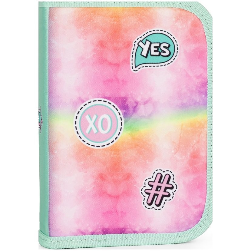 Školní penál: Jednopatrový se dvěma chlopněmi, poutka na psací potřeby a průhledná fólie na rozvrh hodin.