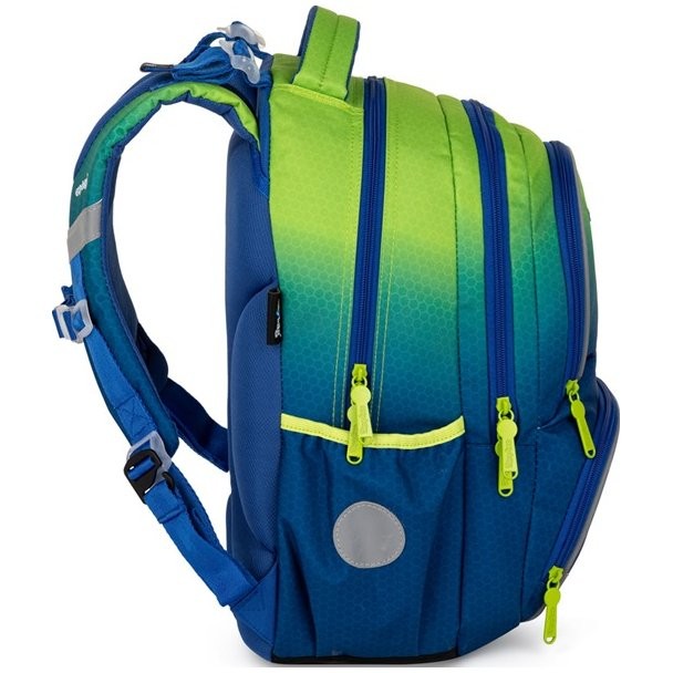 Praktický školní set batohu OXY NEXT, penálu JUMBO a vaku na záda. Školní batoh OXY NEXT Ombre Green je ideální pro děti od 2. - 4. třídy ZŠ. Vhodné pro děti s výškou od 128 cm. Disponuje anatomicky tvarovanými zády, polstrovanými ramenními popruhy a hrudním popruhem. Po stranách najdete dvě větší kapsy. Ať už vaše dítě bude v batohu nosit cokoliv, nic se mu v něm neztratí, batoh totiž nabízí velkorysé množství nejrůznějších kapes, velkých nebo i malých. Hledání klíčů nehrozí, batoh obsahuje i držák na klíče nebo školní čip. Lehký, přitom dostatečně velký pro všechny věci, které chce mít každý školák po ruce. Mysleli jsme také na bezpečnost vašich dětí, batoh do školy je vybaven velkým množstvím reflexních prvků. Dno batohu je opatřeno zpevněným nepromokavým materiálem.