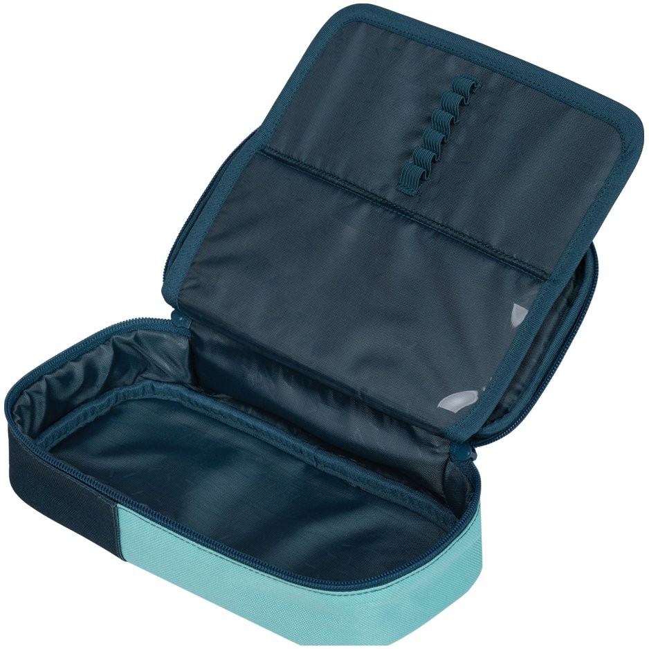 Školní penál s výklopnou vnitřní přepážkou a vnitřní kapsičkou na zip, bez náplně. Je vhodný jak pro volné uložení psacích potřeb, tak na jejich zasunutí do 18 gumových poutek na výklopné vnitřní přepážce. Rozměry: 23 x 12 x 5 cm
