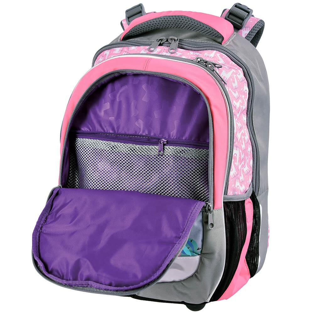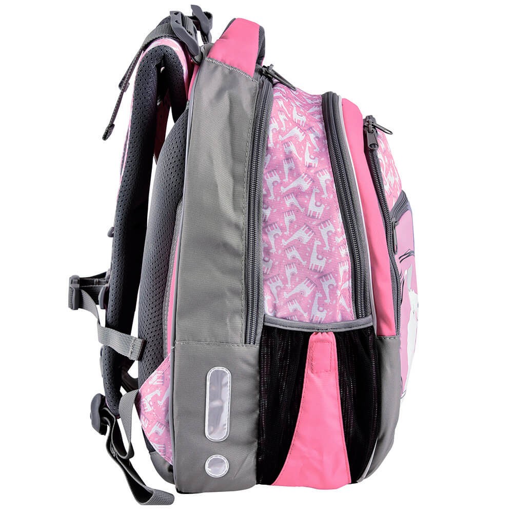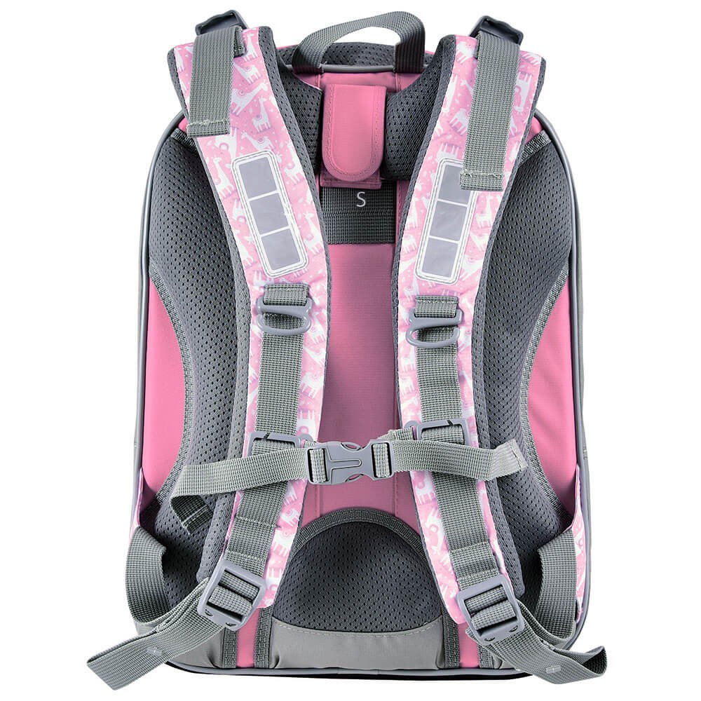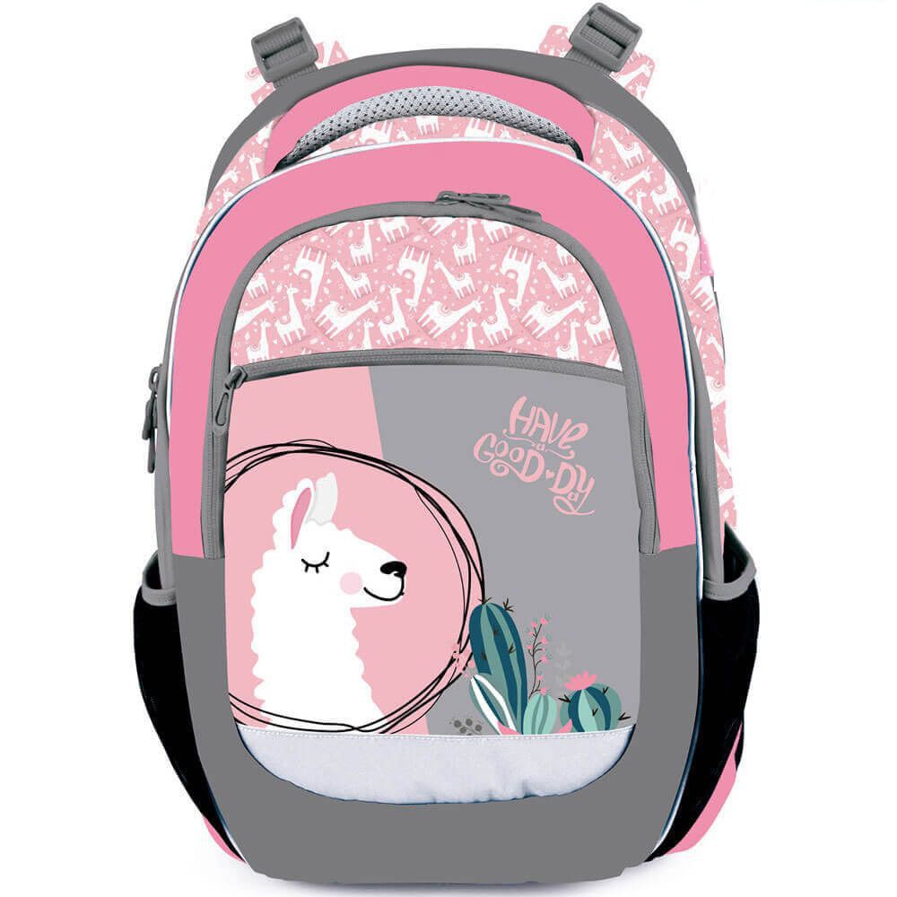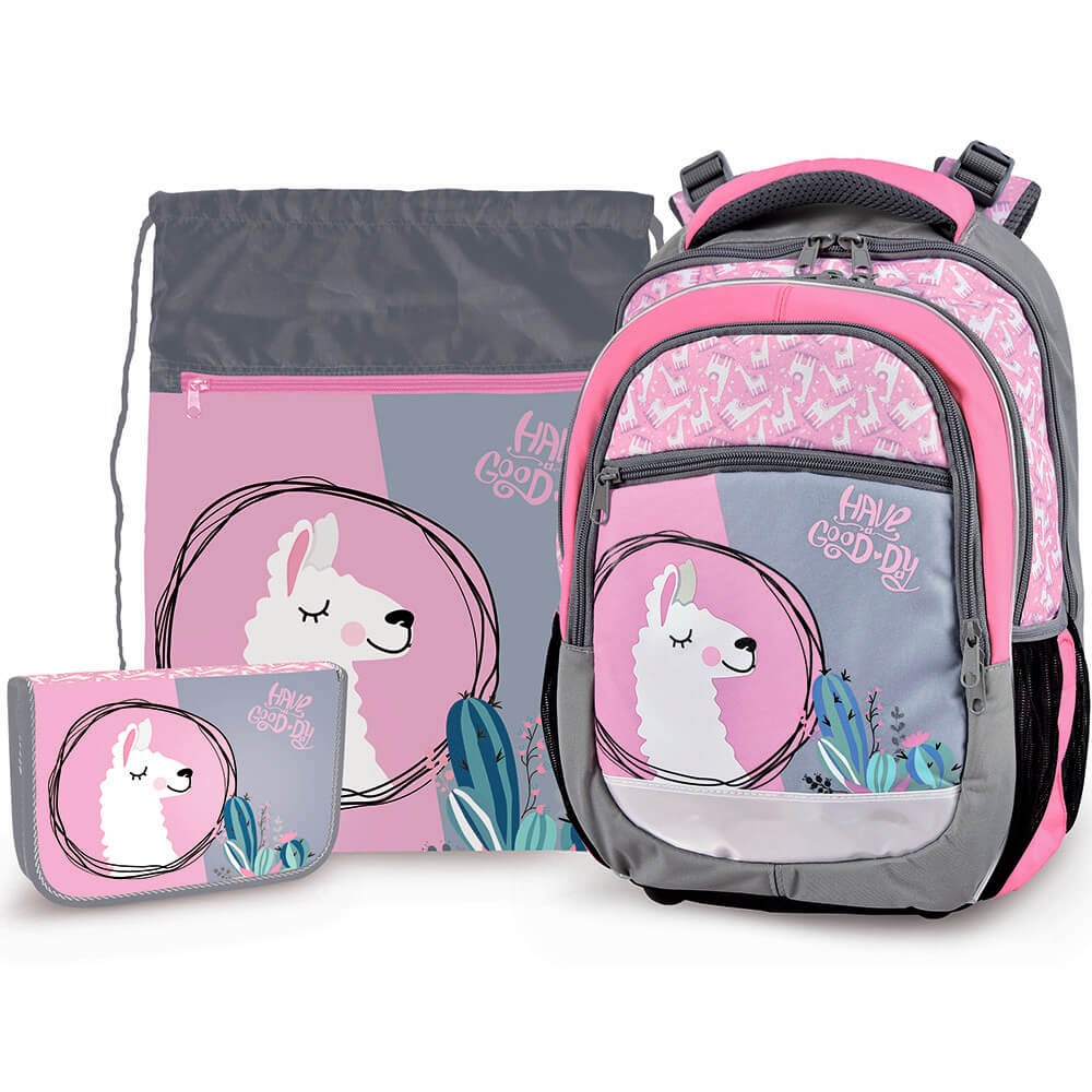 Tříkomorový školní batoh v setu s penálem a sáčkem v sladce růžové barvě s oblíbeným motivem lamy je vhodný od 1. - 4. třídy ZŠ. Výškově nastavitelný systém zad se čtyřmi stupněmi zajistí optimální usazení batohu na zádech podle výšky dítěte. Batoh roste současně s dítětem a díky ergonomickému tvarování zad ideálně sedí na zádech. Batoh má tři hlavní komory a jednu kapsu na drobnosti. Hlavní komora batohu obsahuje oddělenou kapsu pro uložení desek na sešity. Prostřední komora má malou kapsičku na zip a přední komora síťovaný organizér uzavíratelný zipem. Boční síťované kapsy jsou určeny k přenášení láhve na pití a jsou zakončeny suchým zipem. Systém Air Flow a prodyšné polstrování umožní dobrou cirkulaci vzduchu a příjemné nošení. Polstrované nastavitelné ramenní popruhy doplňují přídavné dotahovací pásky a hrudní popruh pro zvýšení komfortu při nošení. Batoh je doplněn ze všech stran o reflexní prvky pro zvýšení bezpečnosti. Na přenášení v ruce slouží měkce polstrované madlo, pro zavěšení pak textilní poutko.