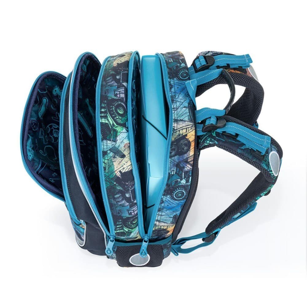 Vnitřní prostor je přehledně členěný tak, aby se v něm malé děti snadno orientovaly. Do hlavní komory doporučujeme uložit učebnice nebo desky na sešity, přední kapsa je ideální na lehčí školní výbavu, například penál nebo box na svačinu. Samozřejmostí je také odnímatelná karabina na klíče. Do boční kapsy se pohodlně vejde lahev na pití o objemu 0,5 litru. Batoh je vybaven reflexními prvky na čele, bocích i ramenních popruzích, které zvyšují bezpečnost dítěte na cestě do školy.