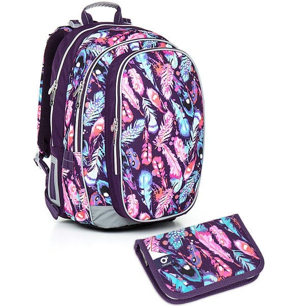 Dvoukomorový školní batoh s velkou přední kapsou kolekce CHILLI s motivem peříček vhodný pro 3. až 5. třídu ZŠ. Díky motivu, který se neokouká, a prostornému provedení batoh se svou majitelkou poroste několik školních let. Dvě hlavní komory, z nichž jedna je dělená, jsou ideální k uložení školních desek a učebnic. V zadní komoře najdeme vnitřní kapsičku na drobnosti, v přední kapse se nachází jmenovka a odnímatelná karabina na klíče. Batoh má elastickou kapsu na láhev umístěnou prakticky na vnější straně. Samozřejmostí jsou ergonomicky řešené ramenní popruhy i vyztužení zad s odnímatelným hliníkovým rámem.