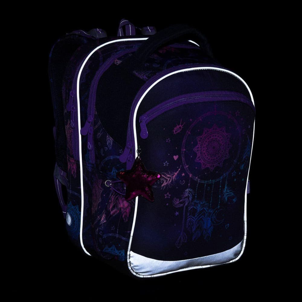 Tmavomodrý tříkomorový model COCO je oblíbeným střihem dívek v první třídě, ale i drobnějších školaček ve vyšších ročnících prvního stupně ZŠ. Batoh s lapačem snů doporučujeme pro slečny s výškou od 120 cm. Celkový design podtrhne třpytivý přívěsek ve tvaru hvězdy. Praktická tmavá barva nevyžaduje náročnou údržbu a navíc skvěle doplní každodenní outfit.