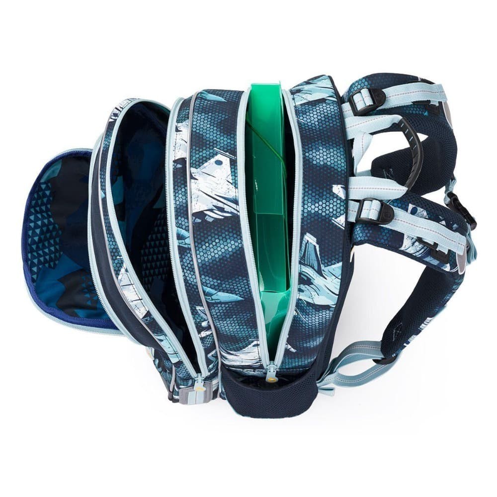 Batoh má dvě objemné hlavní komory. Zadní komora je objemnější a spolehlivě pojme všechno učení. Přední komora je o něco užší a skrývá malou síťovou kapsu na zip a jmenovku.