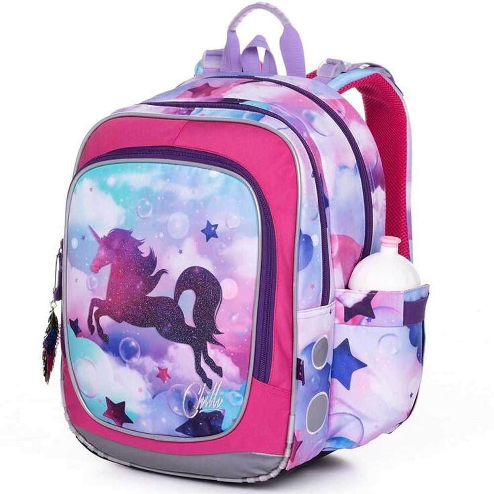 Jednorožec, přívěsek, hvězdičky, bublinky, prostě snová atmosféra na lehounkém batohu pro vaše malé drobné školačky v první až třetí třídě ZŠ. Díky pevným lisovaným zádům je konstrukce batohu ENDY velmi lehká. Proto jej můžeme doporučit i pro drobné dívky pod 120 cm. Díky dvěma komorám a hluboké přední kapse ale objemem určitě vydrží nejméně do třetí třídy ZŠ.Ramenní popruhy batohu lze utáhnout jak v jejich spodní části k tělu, tak i v horní části k zádům. Ani z drobných zad padat nebude díky výškově nastavitelné hrudní přezce. Konečky ramenních popruhů jsou opatřeny magnetky. Díky nim je můžete připnout k ramennímu popruhu a nebudou vlát kolem těla.Batoh má dvě objemné hlavní komory. Zadní komora je širší - doporučujeme k zádům dávat nejtěžší učebnice nebo desky na sešity. Přední komora je o něco užší a je v ní umístěna ještě malá síťová kapsa na zip a jmenovka.Přední hluboká kapsa pojme např. penál PENN 20002 ve stejném designu, nebo krabičku na svačinku. V kapsičce najdete i odnímatelnou karabinku na klíče. Pití je dobré umístit do kapsy na boku batohu, která je nově látková. Dobře se do ní vejdou lahvičky o objemu 0,5 litru, např. naše lahvička ZIVA.I malí školáci musejí být vidět, zvláště v zimním období, proto jsme batoh opatřili řadou reflexních prvků. Najdete je na čele batohu, kde jsou i v lemovkách přední kapsičky a přední komory, na boku batohu, ale i na ramenních popruzích.Tak honem, letíme do školy!