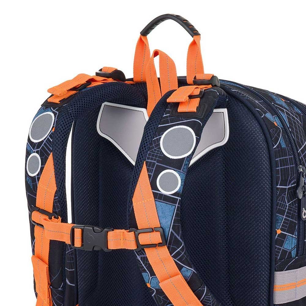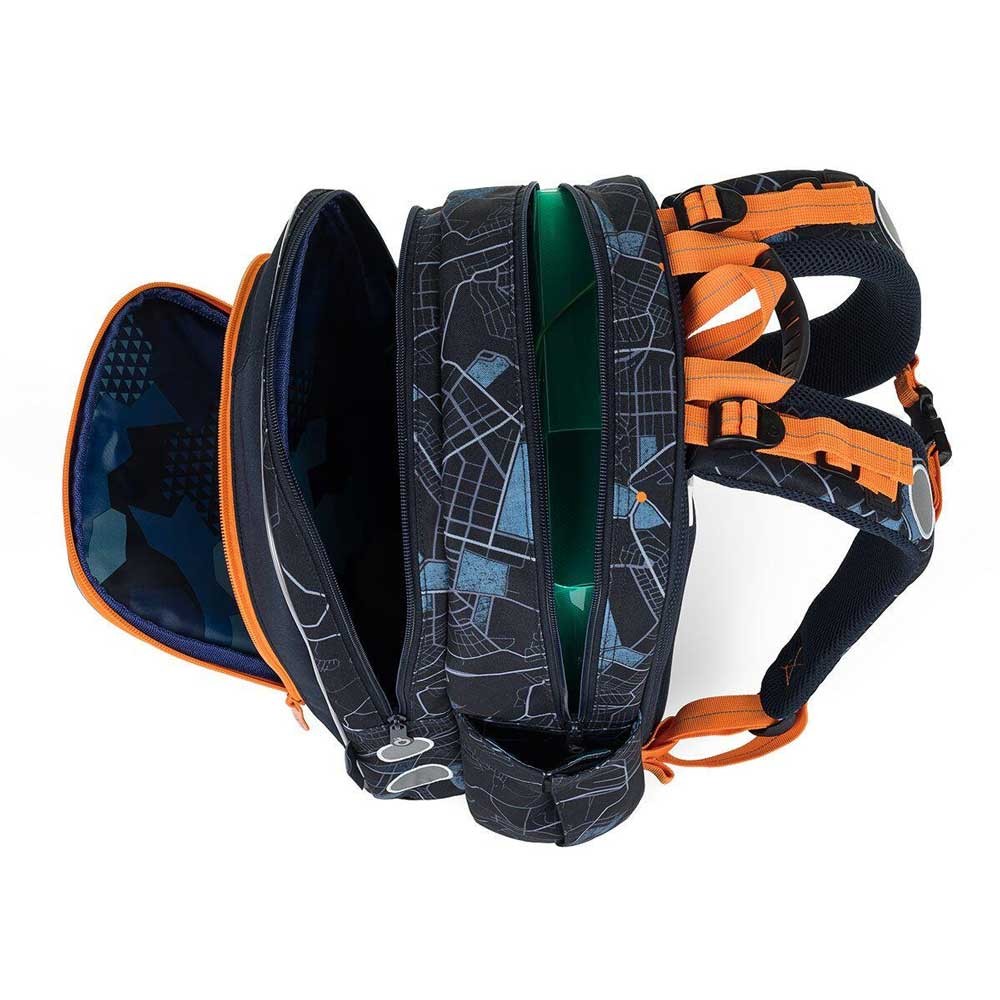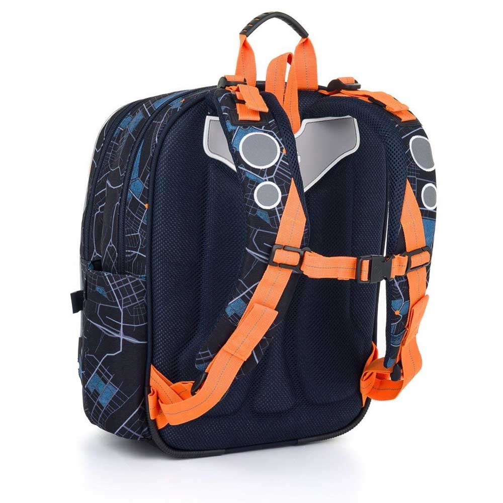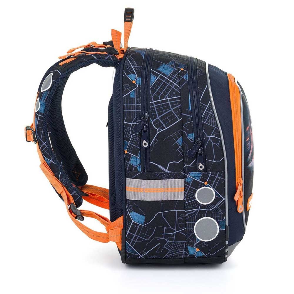 Model ENDY je dvoukomorový batoh, který neváží ani kilogram. Doporučujeme jej klukům s výškou od 110 cm, do první až třetí třídy ZŠ. Batoh má dvě objemné hlavní komory. Do nejširší zadní komory dejte nejtěžší učebnice nebo desky na sešity. Přední komora je o něco užší, je v ní ukrytá malá síťová kapsa na zip a jmenovka. Přední hluboká kapsa pojme penál nebo krabičku na svačinu. Do bočních kapes se vejdou lahve na pití o objemu 0,5 litru.