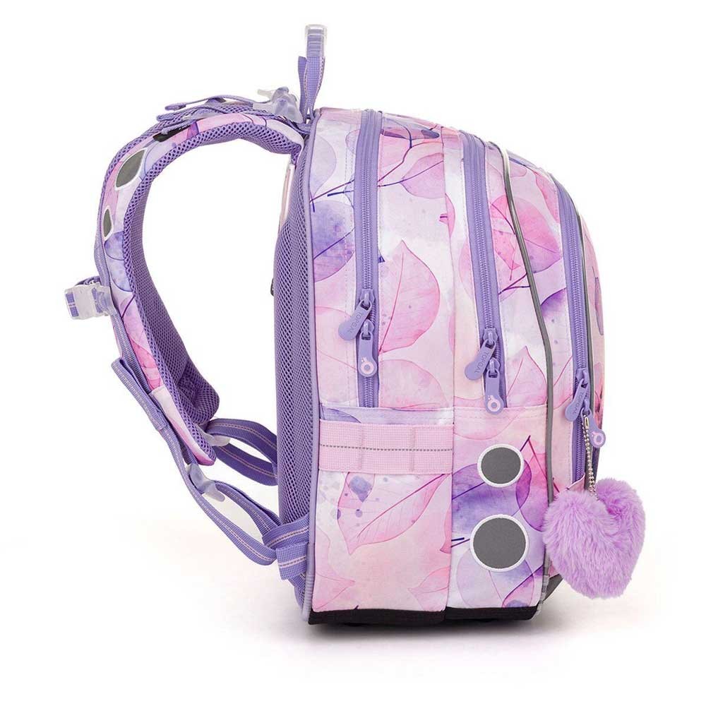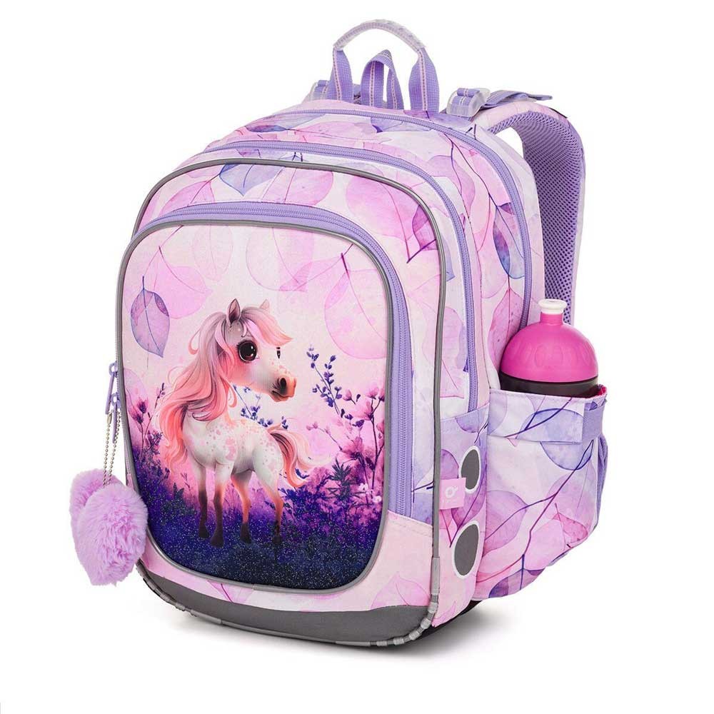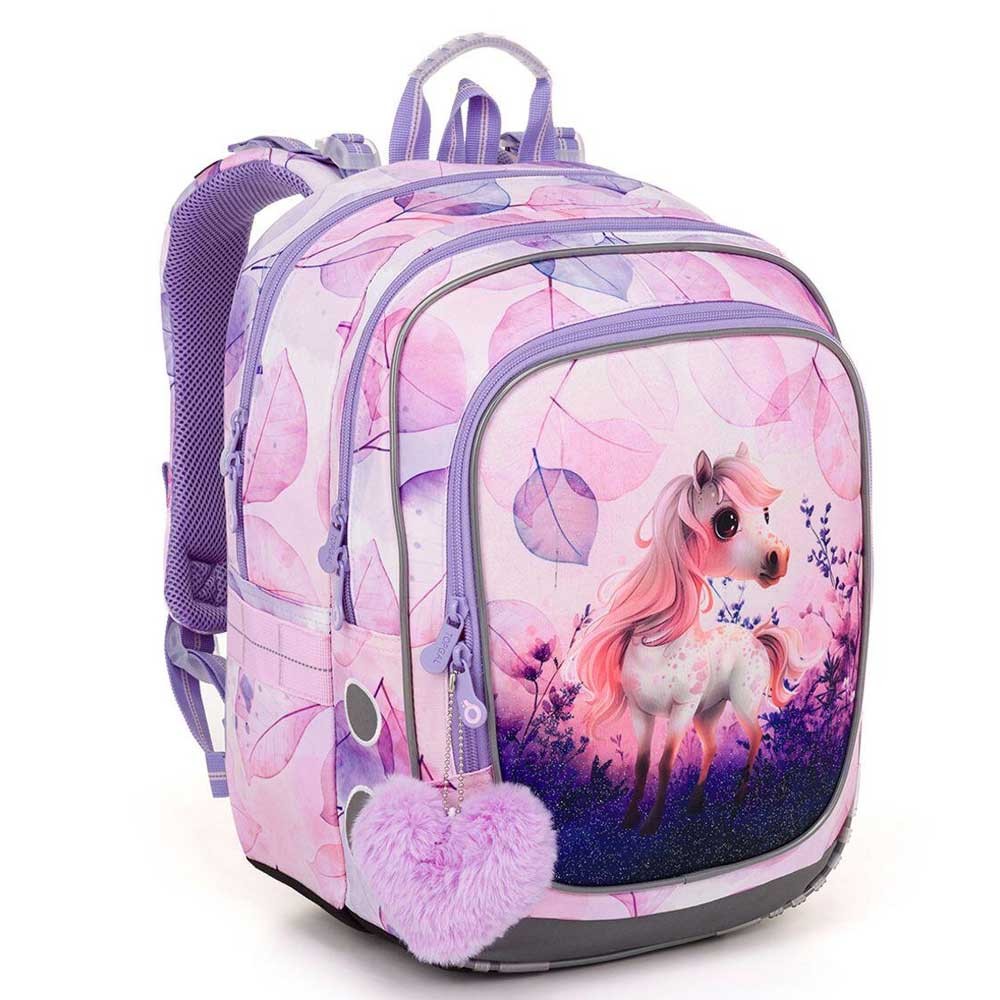 Lehoučký dvoukomorový školní batoh ENDY v něžných odstínech fialové s roztomilým koníkem a huňatým srdíčkem perfektně padne drobným školákům od první do třetí třídy ZŠ. Skvělý parťák pro malé školačky od 110 cm neváží ani kilogram.