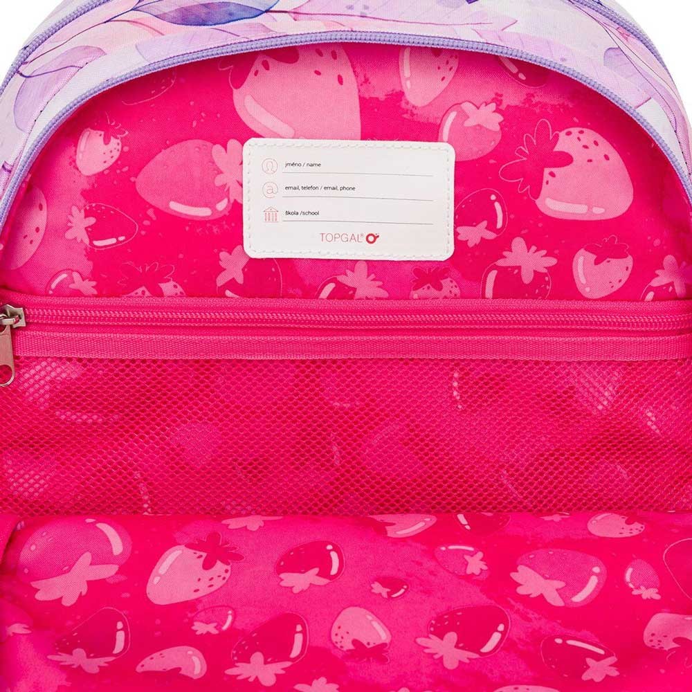 Do prostorné zadní komory doporučujeme ukládat nejtěžší učebnice nebo desky na sešity, směrem k přední části pak lehčí věci. Přední komora je užší, obsahuje praktickou síťovou kapsu na zip a jmenovku. Ideálně se hodí na penál ve stejném designu nebo box na svačinu. Do boční kapsy pohodlně vložíte lahev na pití s objemem 0,5 litru.