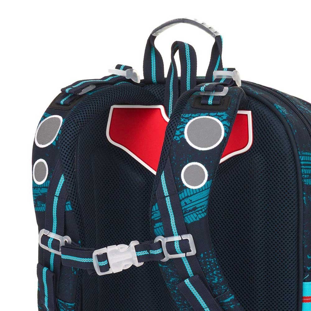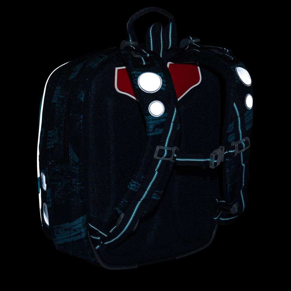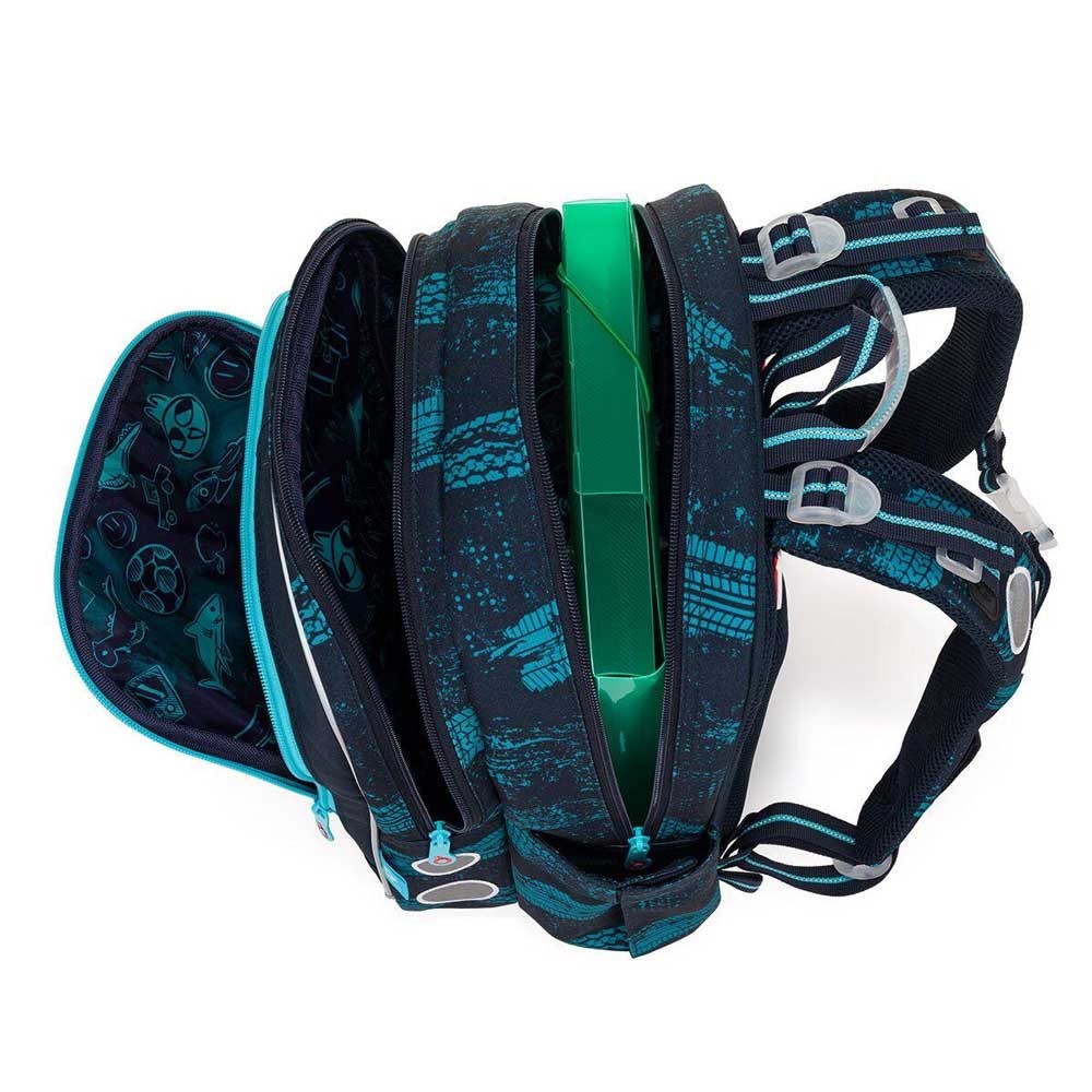 Batoh má dvě prostorné komory – do zadní je nejlepší ukládat nejtěžší učebnice nebo desky na sešity, do přední pak penál, svačinu nebo další drobnosti. V přední komoře nechybí ani síťová kapsa na zip a praktická jmenovka. Do boční kapsy pohodlně vložíte lahev na pití s objemem 0,5 litru.