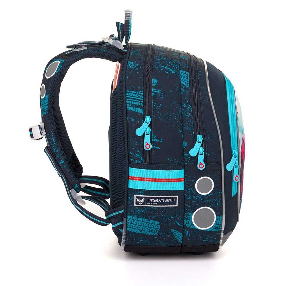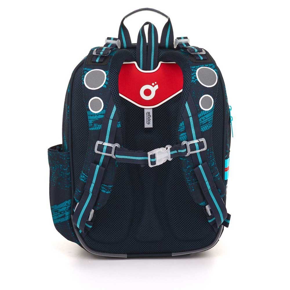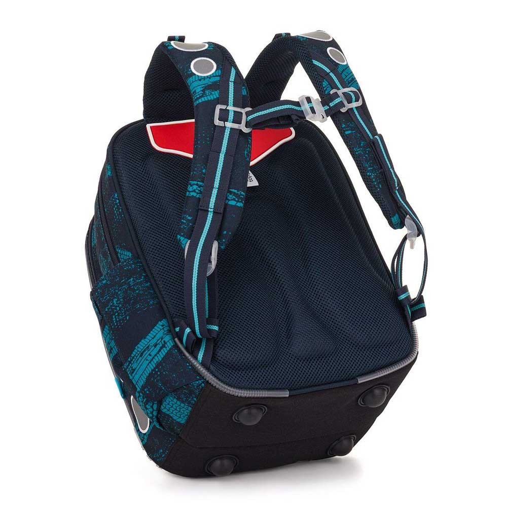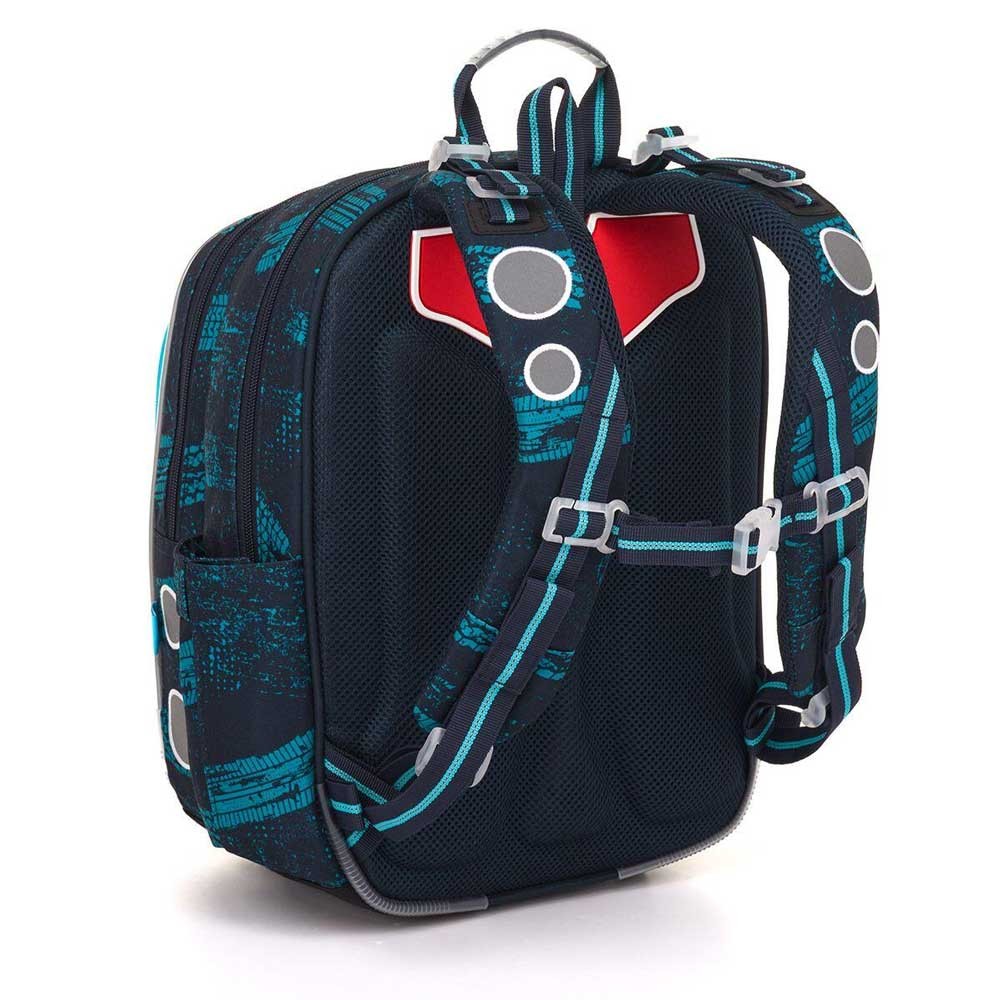 Batoh má dvě prostorné komory – do zadní je nejlepší ukládat nejtěžší učebnice nebo desky na sešity, do přední pak penál, svačinu nebo další drobnosti. V přední komoře nechybí ani síťová kapsa na zip a praktická jmenovka. Do boční kapsy pohodlně vložíte lahev na pití s objemem 0,5 litru.
