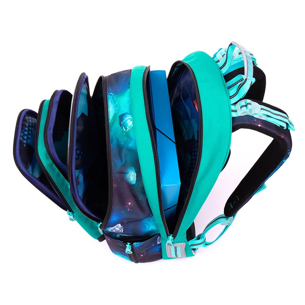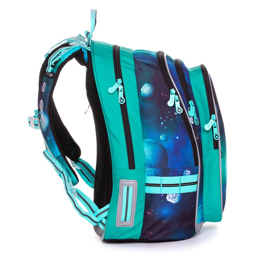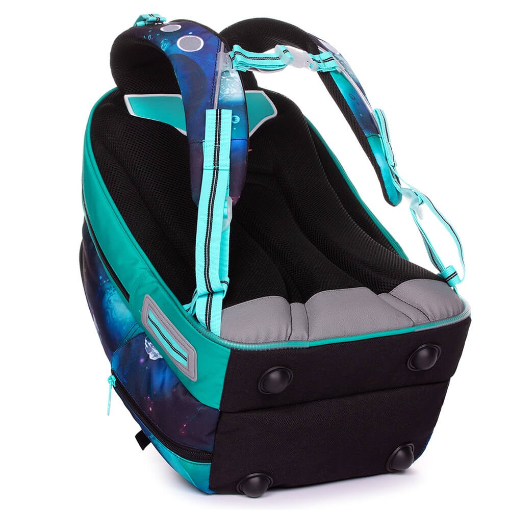 Batoh má anatomicky tvarovaný zádový systém s hliníkovou výztuhou a polstrováním, aby docházelo k lepší cirkulaci vzduchu mezi zády školáka a batohem. Hliníkovou výztuhu zad nevytahujte, zádový systém by tak ztratil anatomický tvar a utrpěla by i pevnost batohu. Váha výztuhy je pouze 0,06 kg. Pohodlné nošení i těžkého nákladu zajistí polstrované, ergonomicky tvarované ramenní popruhy. Ty utáhnete jak ve spodní části na délku, tak i v horní části k zádům dítěte. Zapnutím hrudního popruhu, který je taktéž výškově nastavitelný, zajistíte, aby batoh nesjížděl z ramen. Konečky ramenních popruhů jsou opatřeny magnetky, díky kterým je můžete připnout k ramennímu popruhu a nebudou vlát kolem těla.