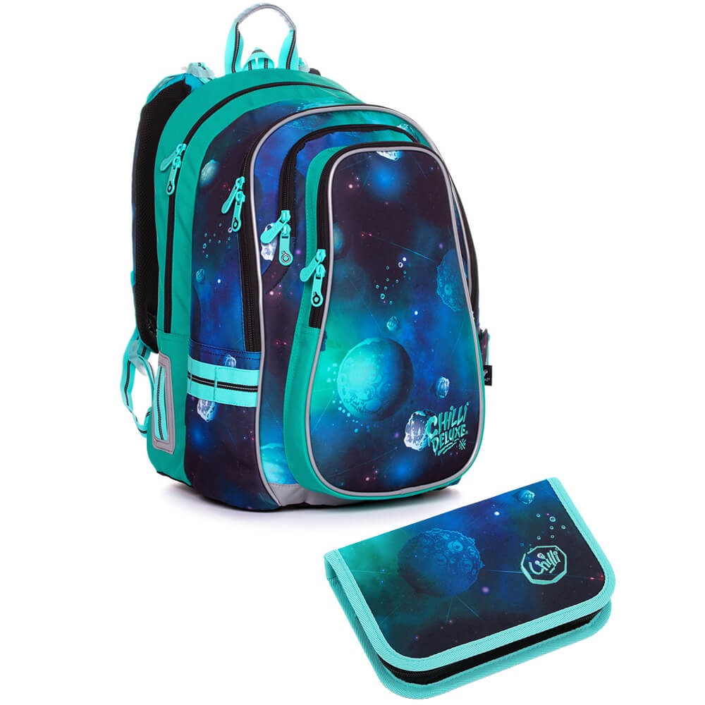 Chlapecký jednopatrový školní penál s jednou klopou a motivem hlubokého vesmíru. Má 18 klasických gumových úchytů na pastelky a fixy, 4 širší úchyty na pravítko, kružítko či nůžky a 2 větší úchyty na gumu a ořezávátko. Pod průhlednou fólií najdete rozvrh hodin.